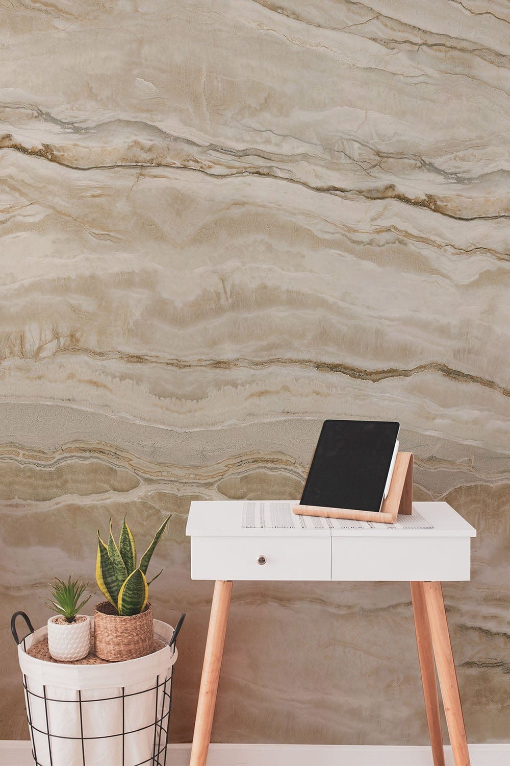 La pierre de couleur pastel clair est taillée avec des veines jaunes pour créer une dalle de marbre calacatta visuellement époustouflante. Élégante et confiante, cette murale capture la variété et la complexité de la pierre naturelle. Papier peint mural disponible en papier peint amovible à peler et coller et en papier peint permanent. Imprimé avec des encres sans danger pour les enfants.