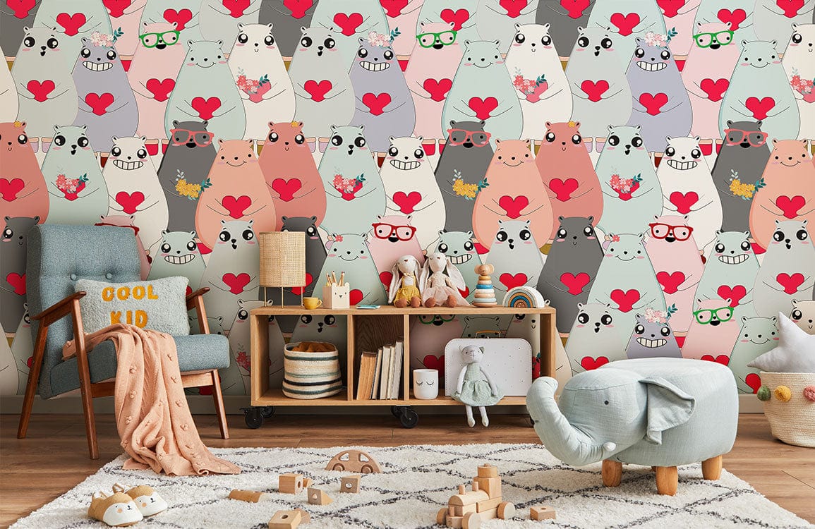 Apportez chez vous une œuvre d'art intemporelle qui montre votre amour pour vos petits. Ce papier peint mural Bears Show Love représente d'adorables ours de bande dessinée avec de grands yeux adorables et tenant des cœurs et des fleurs, comme s'ils vous montraient leur amour ! Parfait pour les chambres d'enfants, les crèches et les salles de jeux, ce papier peint pour crèche fera sourire tout le monde et ajoutera du charme et du caractère à votre maison. Cette peinture murale est facile à installer et existe dans une variété de couleurs, de sorte que vous pouvez la coordonner avec n'importe quel décor.