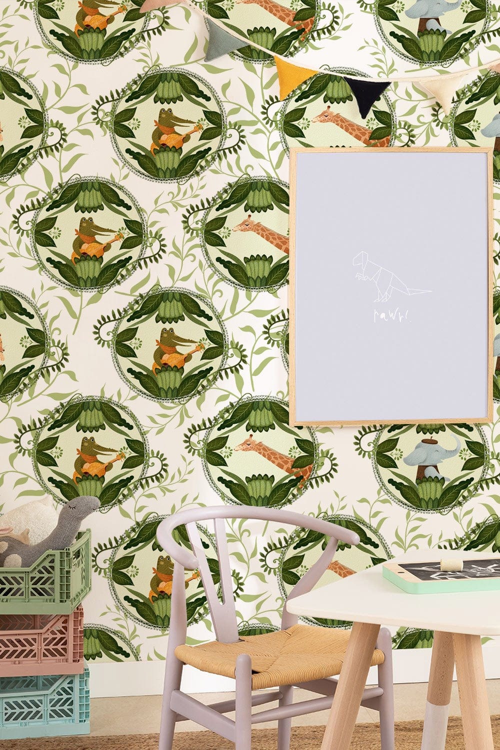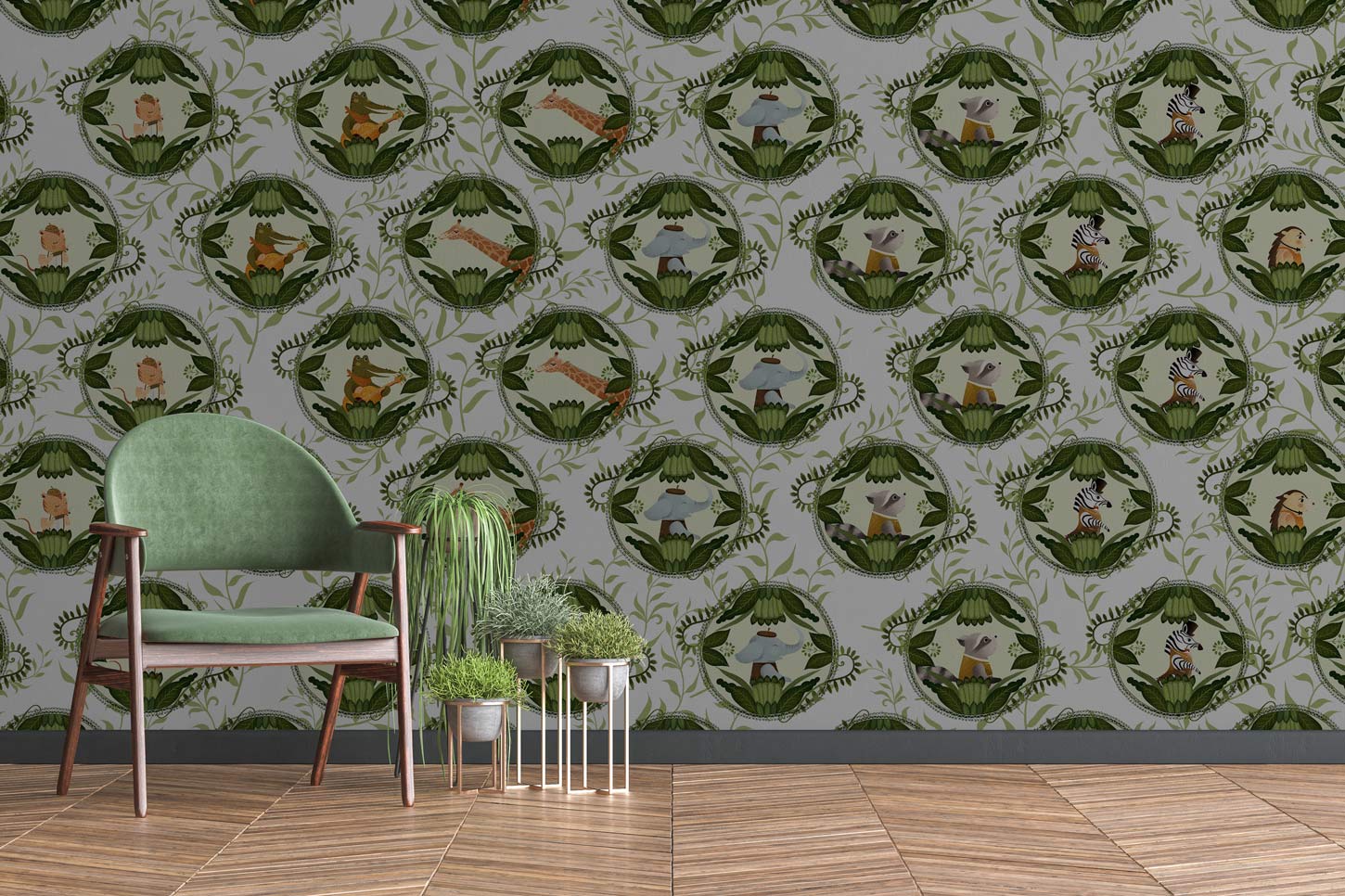Si vous cherchez une murale de papier peint animal mignon qui peut s'adapter à votre espace intérieur et à vos décorations d'art, alors cette murale de papier peint de musicien animal est votre choix parfait. Ce revêtement mural conçu avec des musiciens d'animaux mignons dans un modèle de feuilles vert répété apportera à votre espace un look sysh et accrocheur.