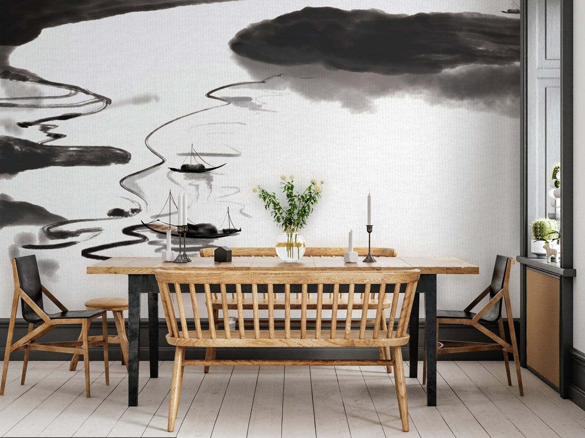 Si vous recherchez une simple fresque murale en noir et blanc dessinée à la main, vous êtes au bon endroit. Ce papier peint utilise simplement du noir pour représenter un magnifique paysage de montagnes et de lacs avec des bateaux dessus. Cette œuvre d'art créative à effet aquarelle ajoutera sûrement une touche de paix et de confort à votre maison. Utilisez-le dans votre salon, votre chambre et votre bureau à domicile pour améliorer votre espace.