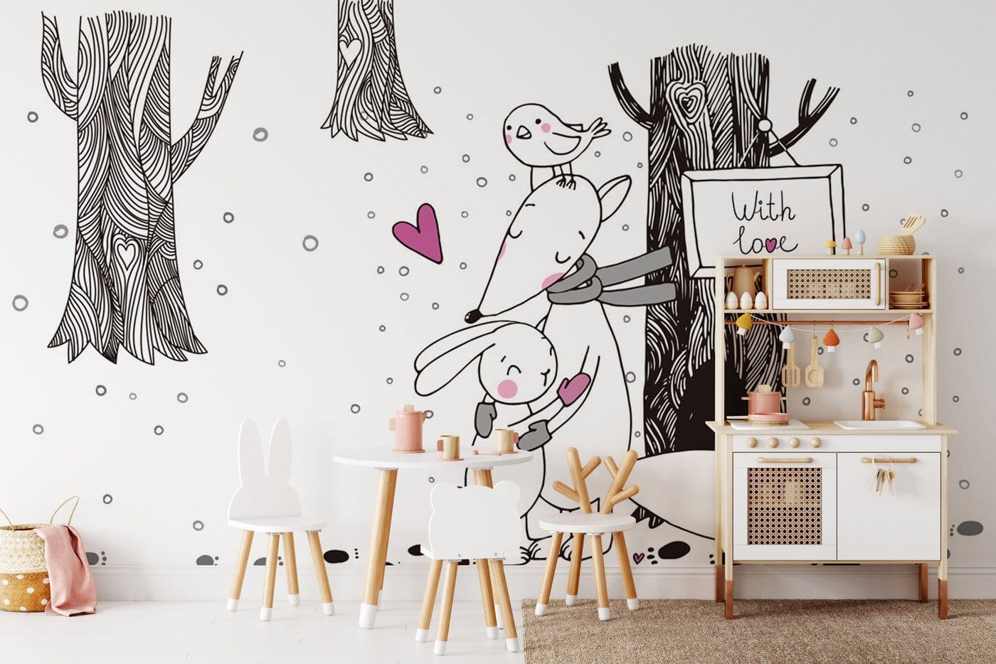 Observez l'enthousiasme de votre enfant lorsque vous habillez les murs de sa chambre avec cette adorable peinture murale en papier peint. Cette conception peinte à la main d'adorables animaux de la forêt qui s'étreignent avec amour et soin ravira à coup sûr votre enfant hors des limites. Complétez le design avec des meubles dans des tons blancs et gris pour un look extraordinaire.