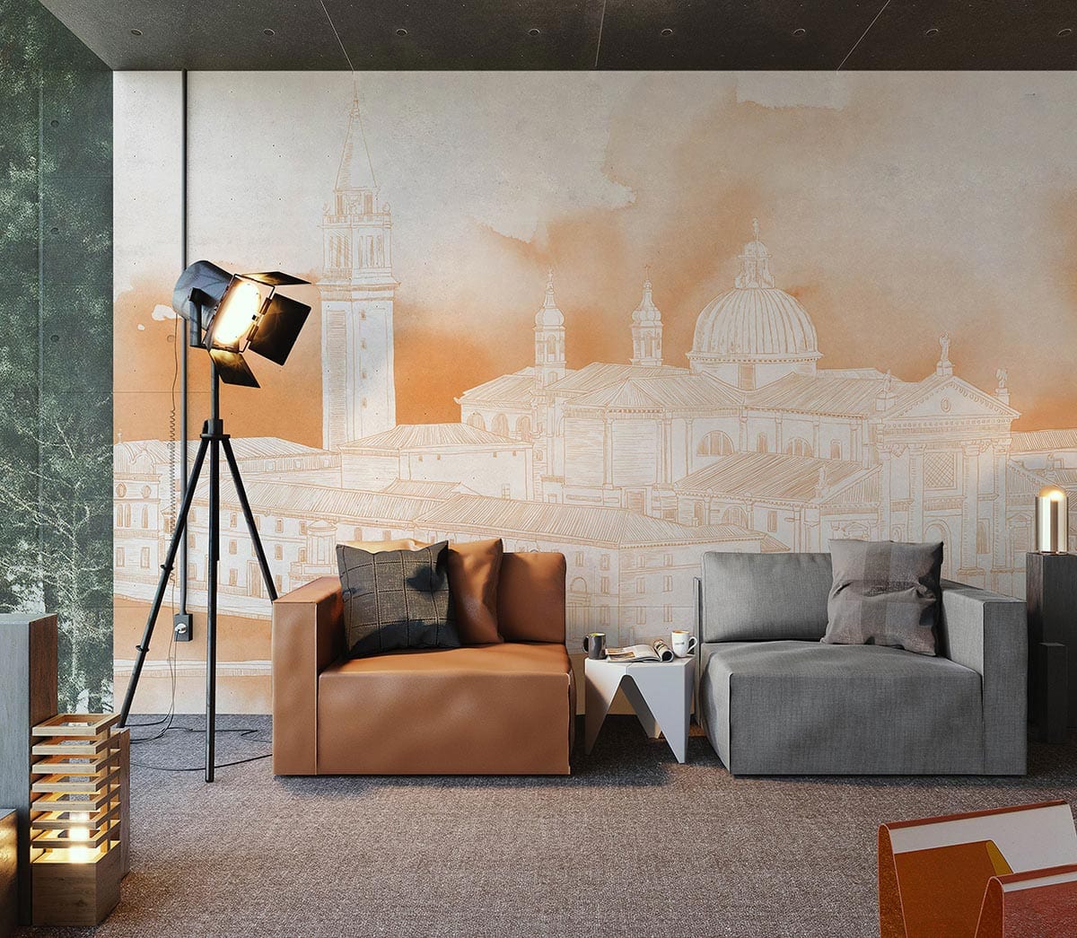 Avec notre papier peint mural Orange Sketch Palace, vous pouvez améliorer votre décoration murale et embellir votre pièce.Cette élégante peinture murale représente une esquisse de palais réaliste, donnant à votre maison une esthétique intemporelle qui va avec n'importe quel design. L'esquisse simple mais impressionnante donne à n'importe quelle pièce une touche chic, tandis que les teintes douces ajoutent une touche sophistiquée aux hôtels et aux restaurants. Ce papier peint classique et vintage est simple à poser et ressemble à une peinture murale peinte à la main, offrant un aspect décoratif à vos murs.