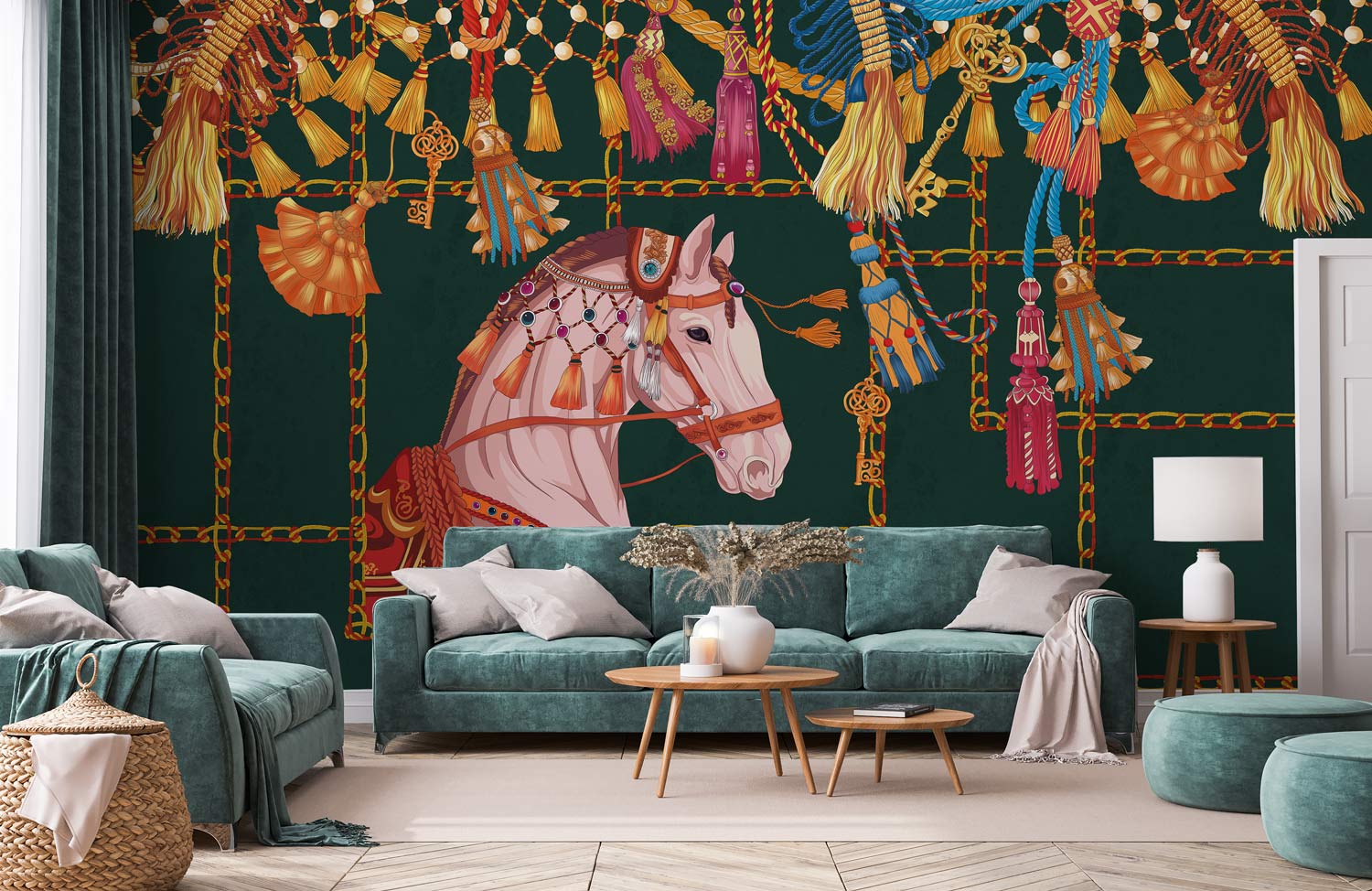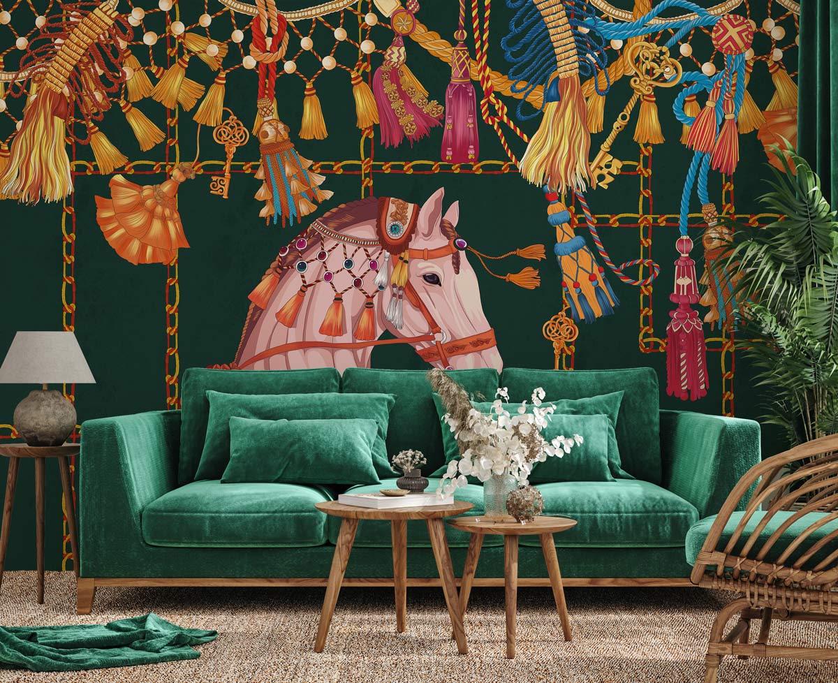 Ce fond d'écran est un design peint à la main avec un magnifique cheval rose et une décoration de glands sous un fond vert foncé. Vous serez étonné de cette scène comme mur de fonctionnalités dans votre salon, votre chambre, votre salle à manger et votre couloir. Fonctionne parfaitement avec des décors et meubles de maison de style traditionnel ou moderne.