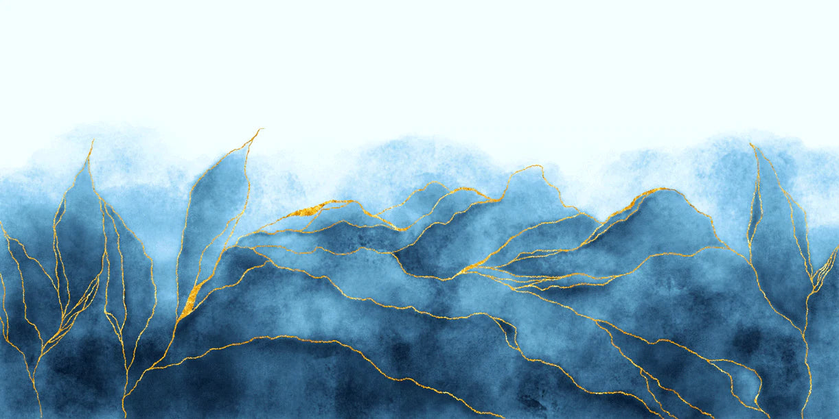Profonde et contemplative, cette fresque murale ombrée combine le calme sophistiqué des tons bleus profonds avec des lignes dorées, qui créent de manière transparente des vagues irisées en haute définition. Papier peint mural disponible en papier peint amovible à peler et coller et en papier peint permanent. Imprimé avec des encres sans danger pour les enfants.