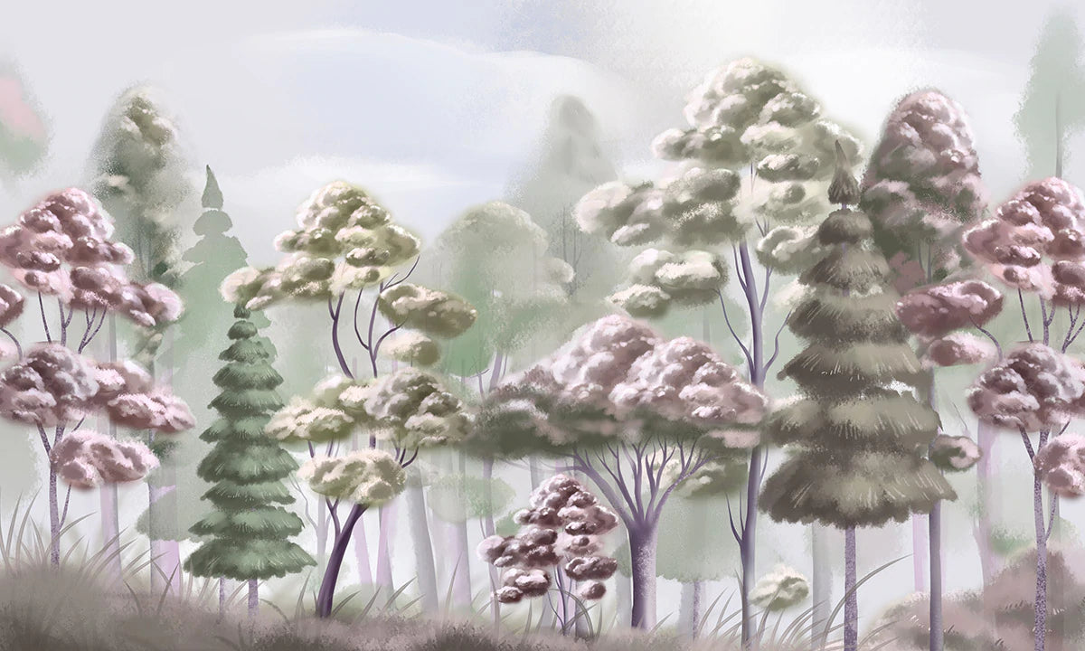 Notre brouillard Forest Wallpaper Mural transformera votre pièce en une beauté naturelle. Installez ce fond d'écran forestier sur votre lieu de travail ou n'importe où à la maison! Avec des arbres verts et roses aussi doux, choisissez d' Cor avec des nuances similaires. Fond mural parfait pour votre chambre, votre salon et votre salon.