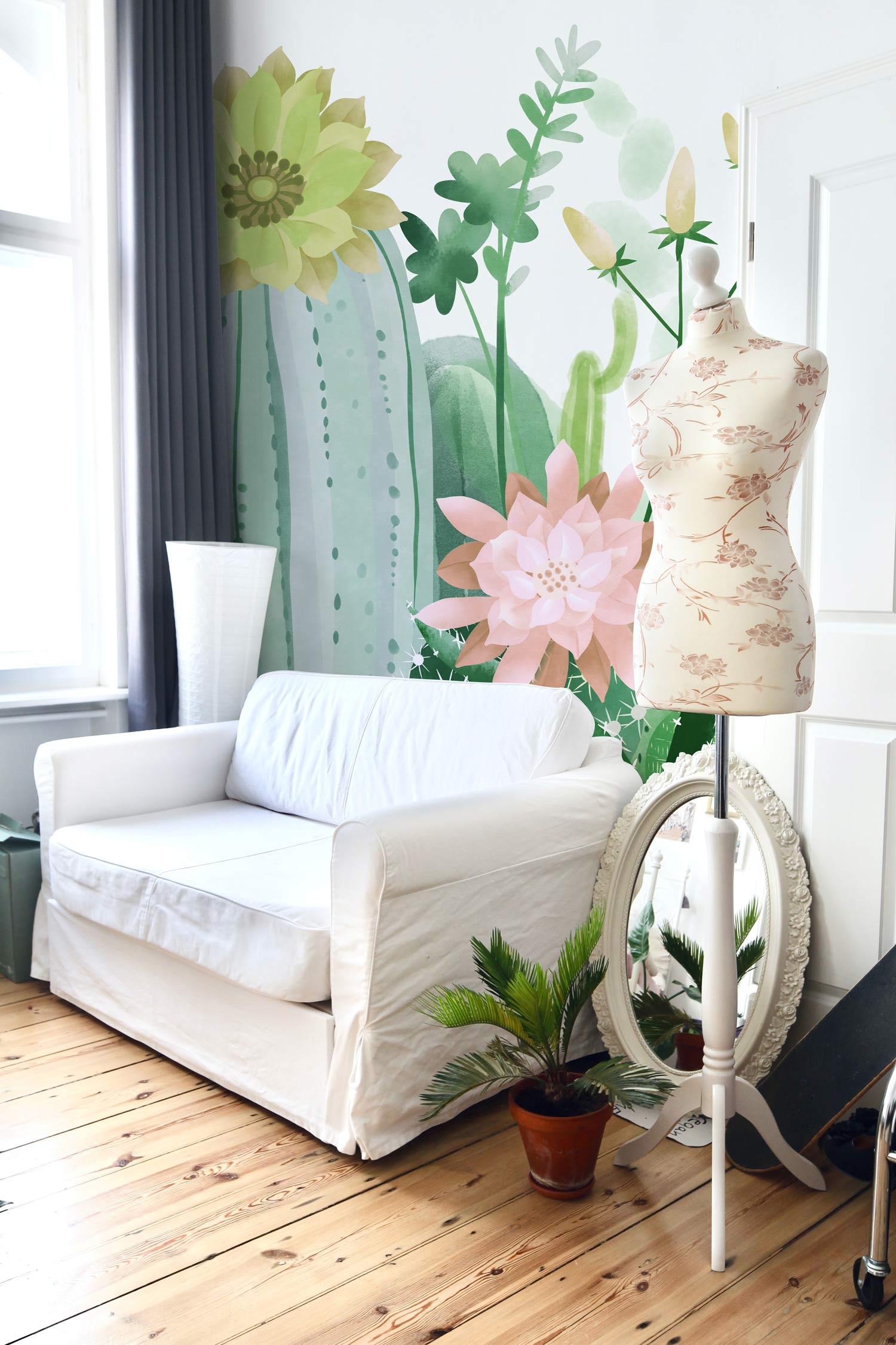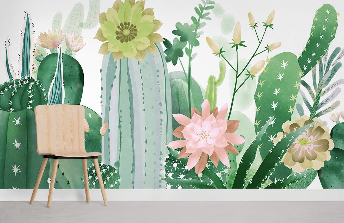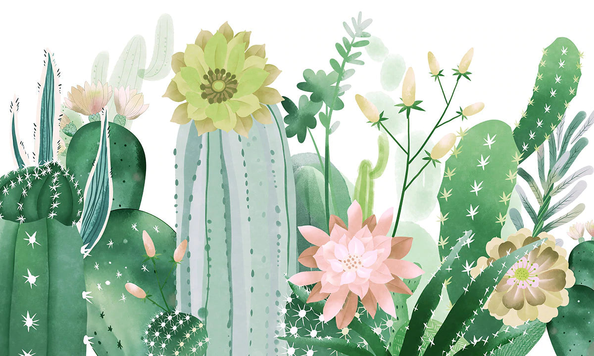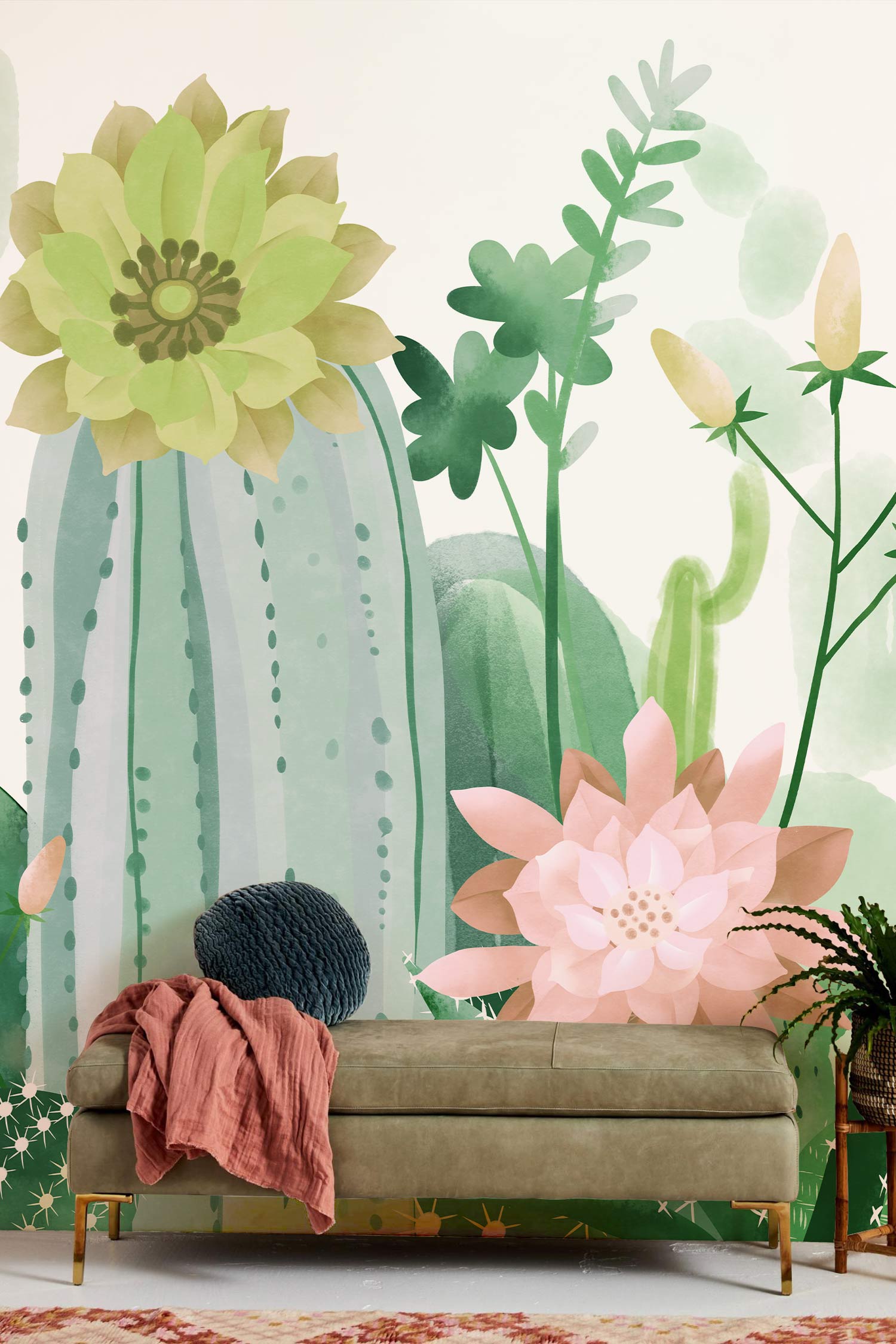orner votre mur avec cette peinture murale cactus et fleur. Laissez ces cactus vert et ces fleurs colorées vous entourent et apportez à vos chambres un nouveau attrait. Ce magnifique fond d'écran botanique garantira de pimenter votre espace intérieur avec son esthétique simple. Fonctionne bien dans une large gamme de chambres telles que le salon, la chambre et la salle à manger.