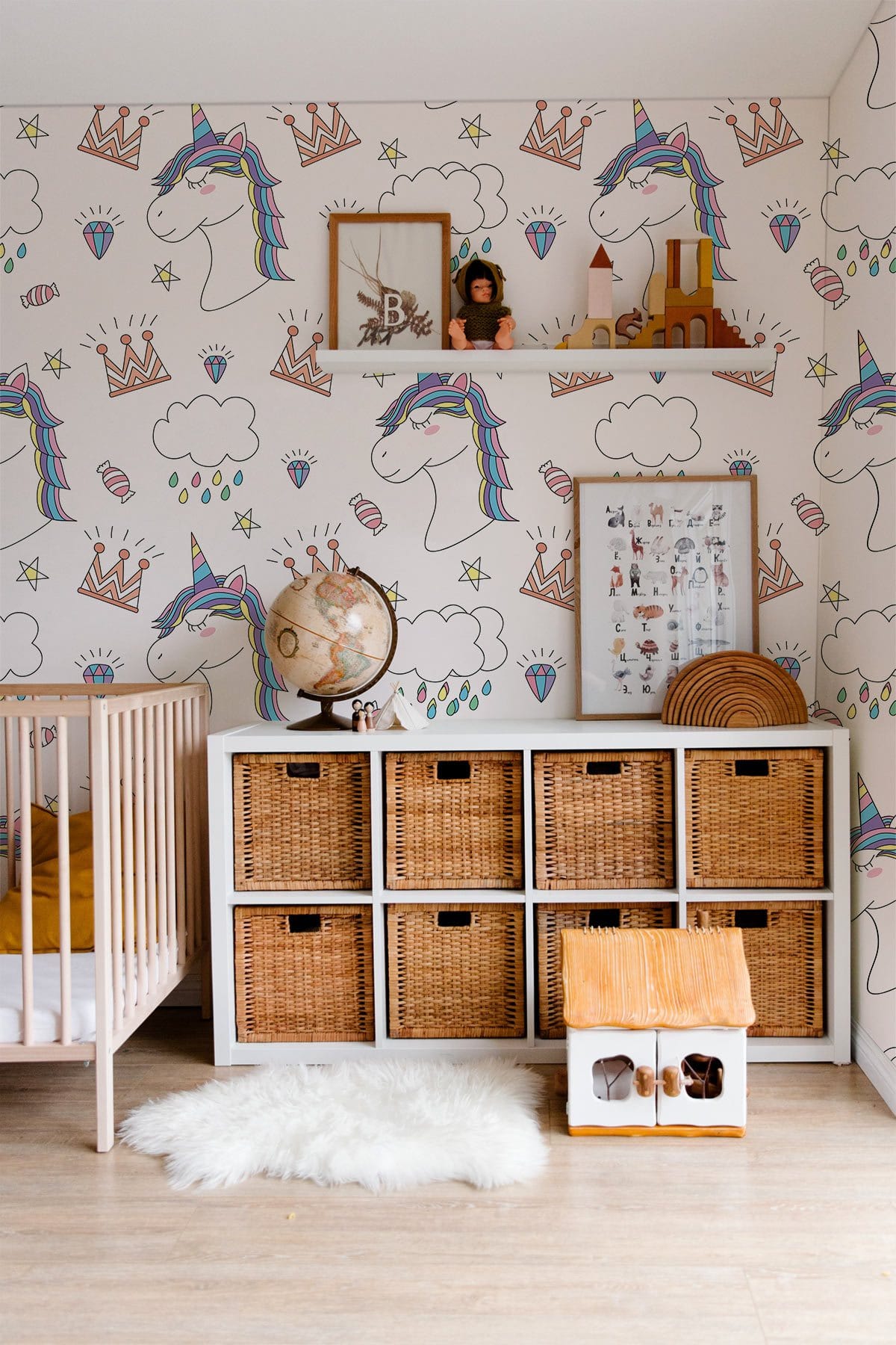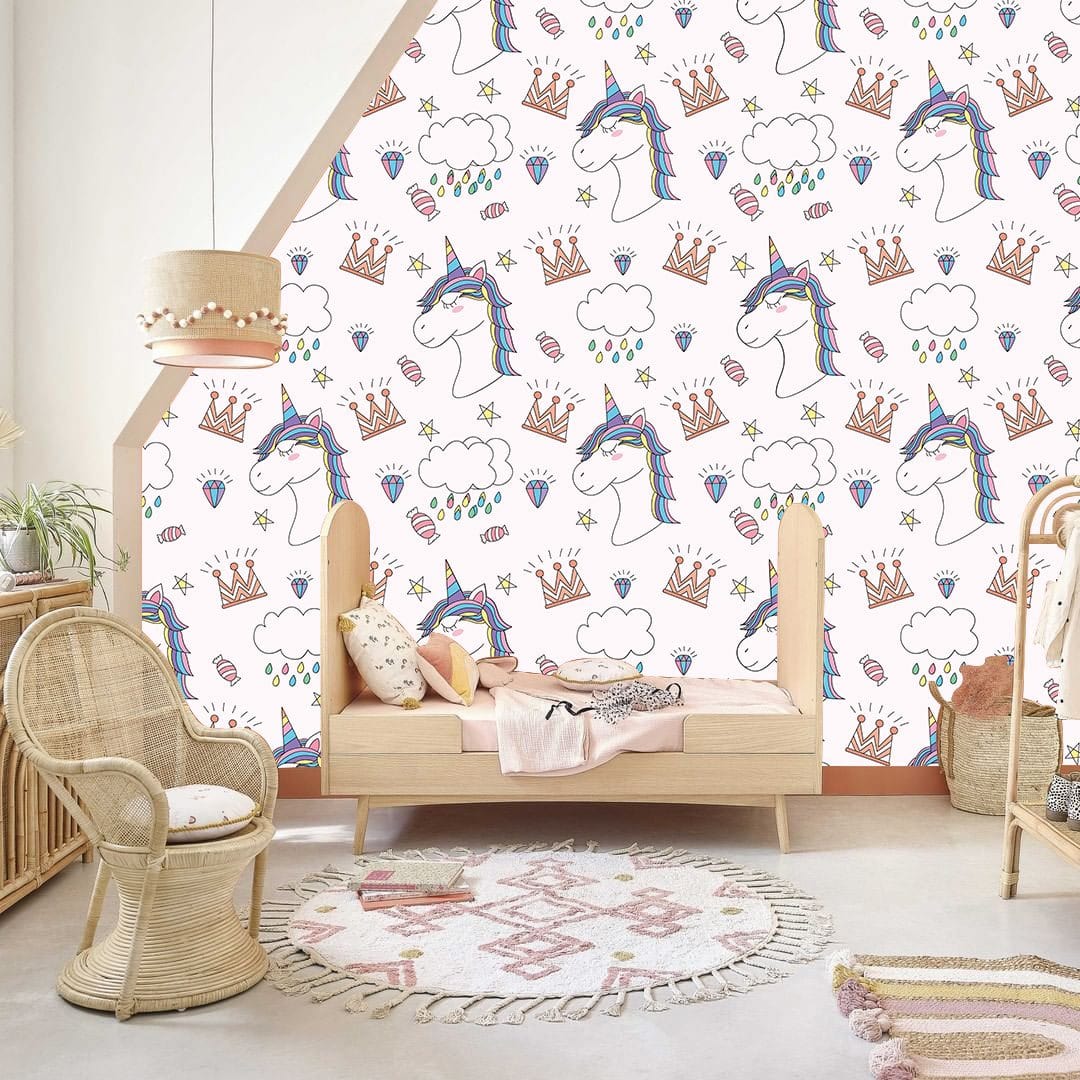 Apportez une belle ambiance à votre espace avec ce papier peint mural de licorne de dessin animé. Conçu avec un motif répété de licorne, de nuages et d'imprimés de couronne sous un fond rose pastel, vos tout-petits tomberont immédiatement amoureux de cette décoration murale. Utilisez-le comme mur caractéristique dans la chambre des enfants, la salle de jeux et; chambre de bébé et associez-la à des meubles de couleur blanche ou pastel de votre choix.