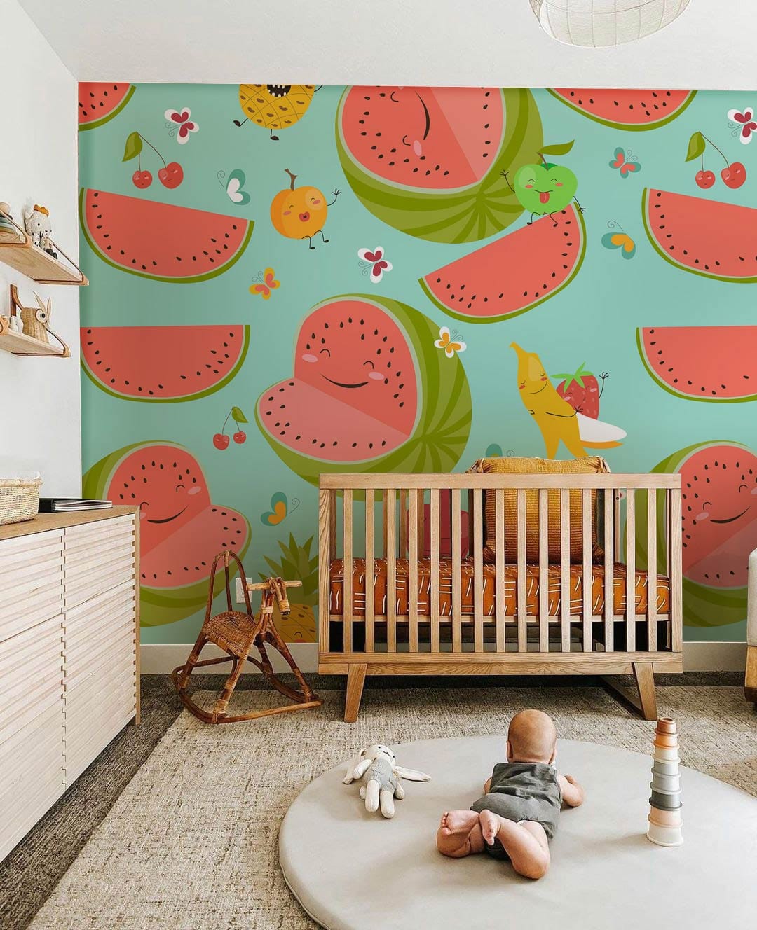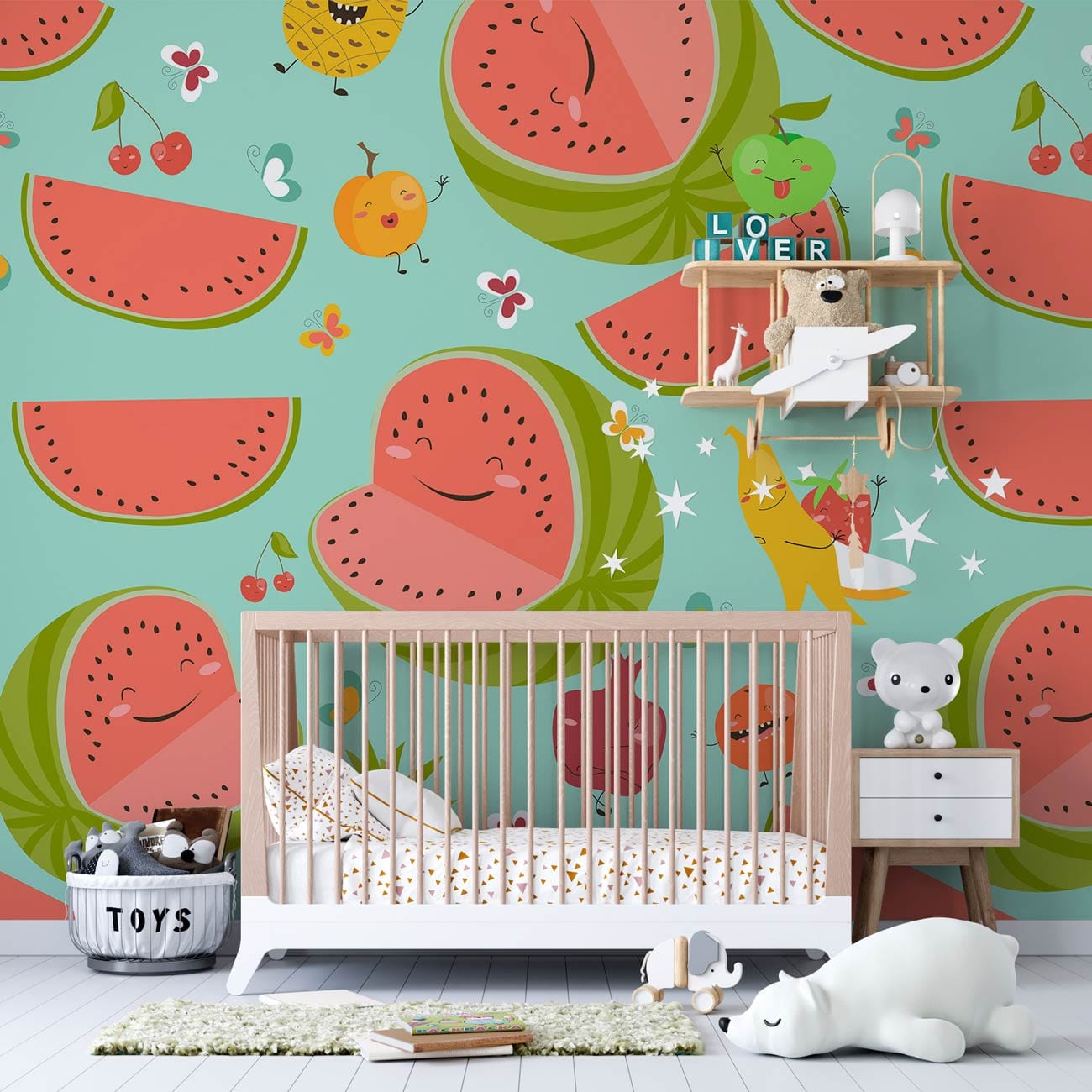 Ce vibrant papier peint mural Cartoon Watermelons vous donne l'aspect lumineux et joyeux d'une parcelle de melon d'eau. Ce papier peint mural est parfait pour ajouter un accent amusant à la chambre de votre enfant, à la cuisine ou à tout autre endroit où vous souhaitez ajouter une touche de couleur ! Disposé en forme de couronne et entouré de feuilles colorées, le motif décorera votre maison d'une manière mignonne et amusante. L'illustration de style vintage de cette décoration murale est garantie pour ajouter un caractère joyeux à n'importe quel espace où vous souhaitez la placer.