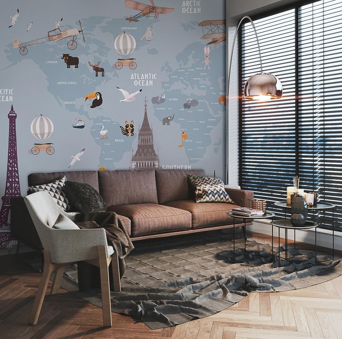 Planifiez votre voyage et aventure autour du monde pour vos enfants avec notre papier peint carte du monde. Ce fond d'écran de carte du monde de dessin animé vous présente les pays du monde entier d'une manière mignonne et amusante. La carte dessine les animaux les plus représentatifs de chaque pays qui aideront vos enfants à découvrir le monde d'une manière vraiment intéressante et efficace. Papier peint idéal pour chambre de bébé et chambre d'enfant.