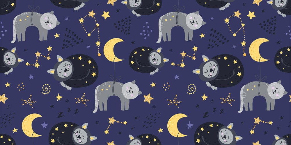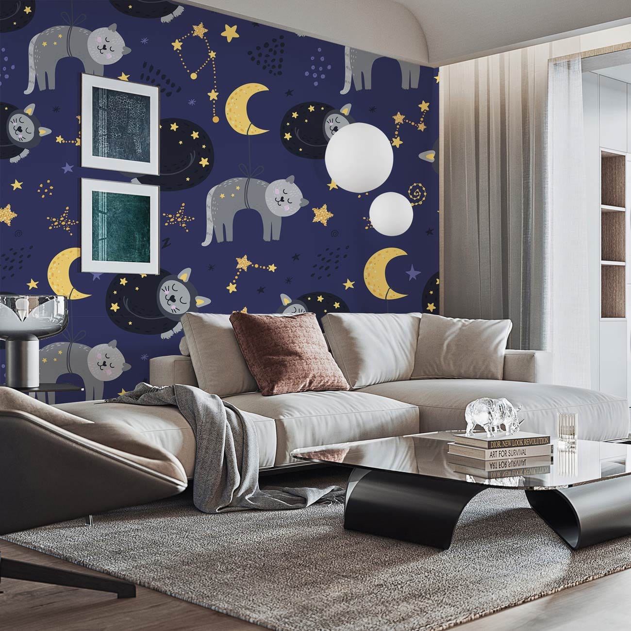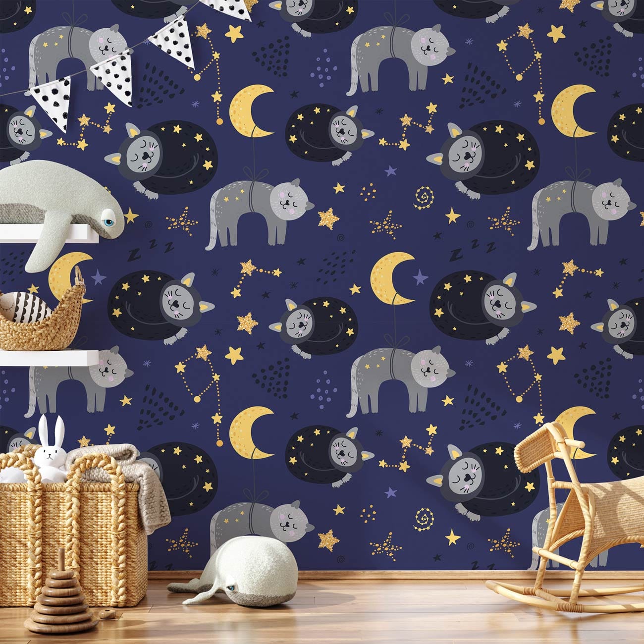 Montrez l'amoureux des félins qui est en vous avec notre papier peint mural Chat endormi ! Ce papier peint mural pour chambre d'enfant est merveilleux et enchanteur, avec un chat endormi et suspendu accompagné d'une lune dorée chaude et d'étoiles, parfait pour égayer la chambre de votre petit. Ce papier peint mural est une façon amusante et inhabituelle d'ajouter un peu de style à la chambre de votre enfant et d'apporter une touche intemporelle à votre espace, avec son design de chat et de lune sur un fond bleu foncé.