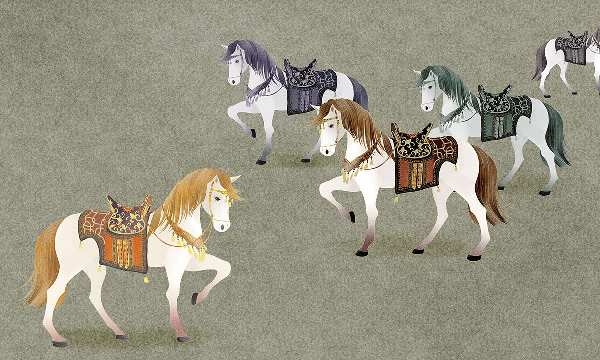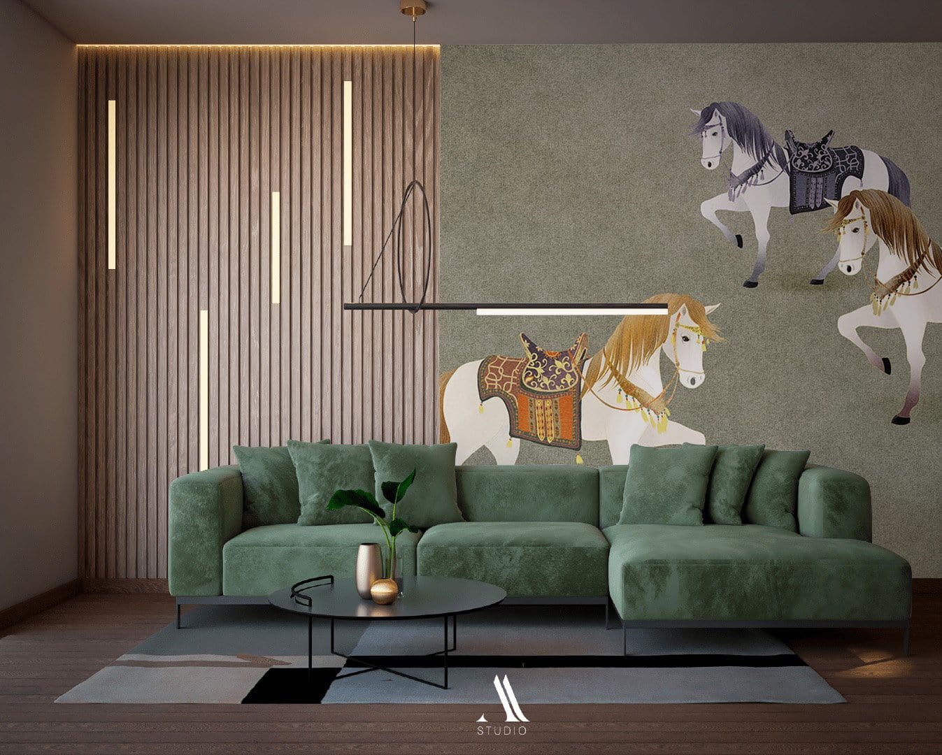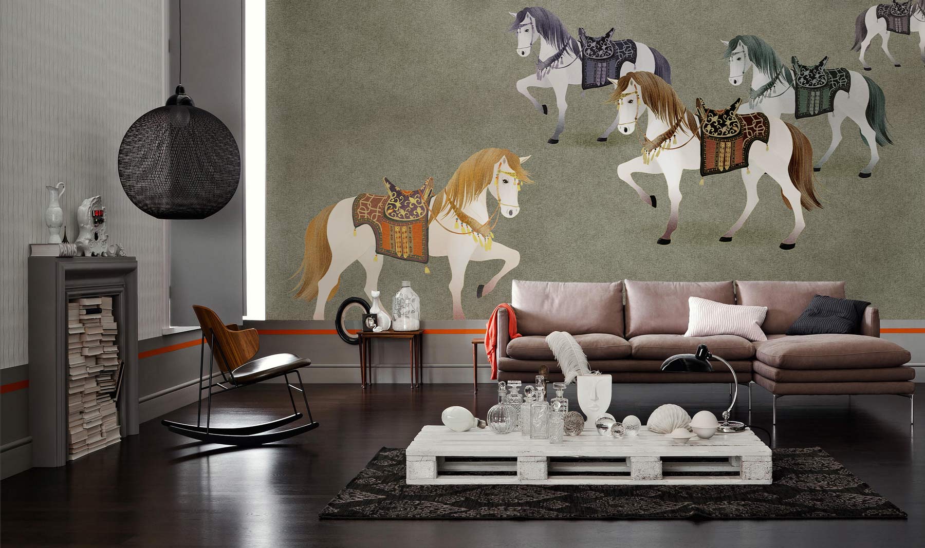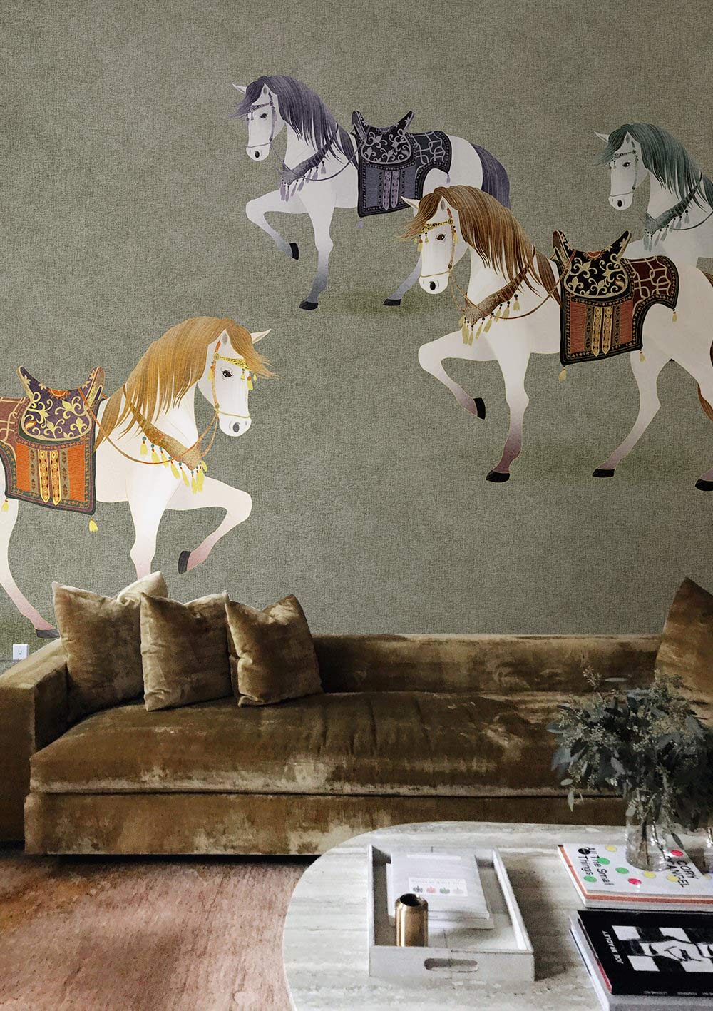 Cette peinture murale est un design peint à la main avec une impression de cheval colorée sous un fond vert pâle. Vous serez étonné de cette scène comme mur de fonctionnalités dans votre salon, votre chambre, votre salle à manger et votre couloir. Fonctionne parfaitement avec des décors et meubles de maison de style traditionnel ou moderne.