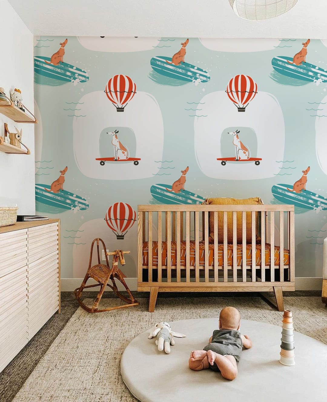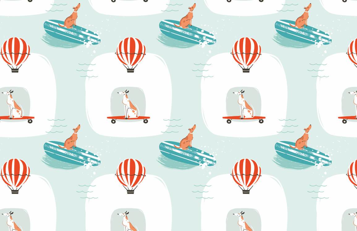 Amusez-vous avec cet adorable murmure de papier peint de chien de surf. Vos enfants vont adorer! Avec ce ballon rouge et un motif de patinage et de surf pour chiens mignons sous un fond vert menthe, toute votre pièce sera en vie. Pourquoi ne pas le placer dans la chambre ou la salle de jeux de vos enfants pour avoir de bonne humeur tous les jours.
