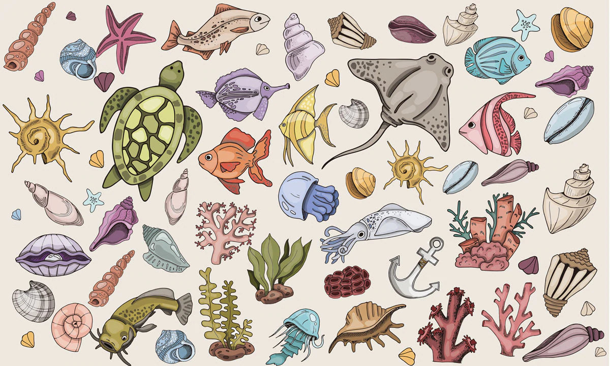 Si vous aimez les animaux marins, alors vous allez adorer ce papier peint mural ! Cette murale en papier peint mettant en vedette de nombreuses créatures marines magnifiques et colorées dessinées à la main telles que des coquillages, des étoiles de mer, des coraux et des tortues, va sûrement réorganiser votre espace ! Superbe papier peint pour votre salon et votre chambre pour un look adorable et unique.