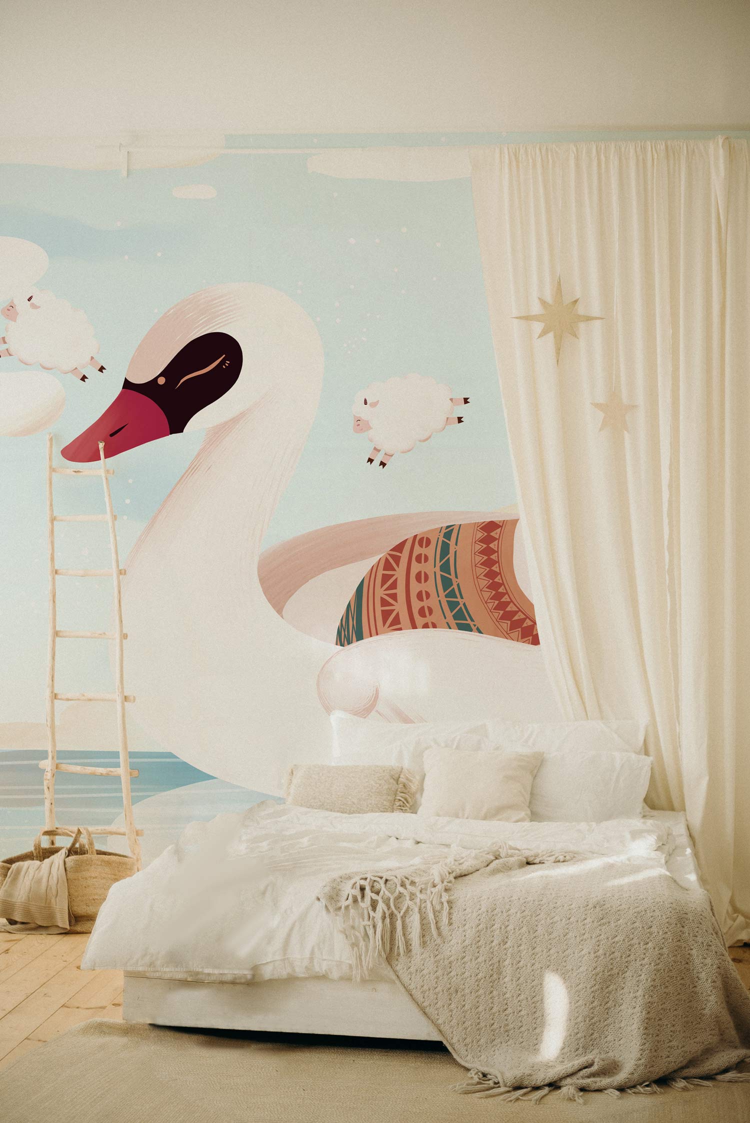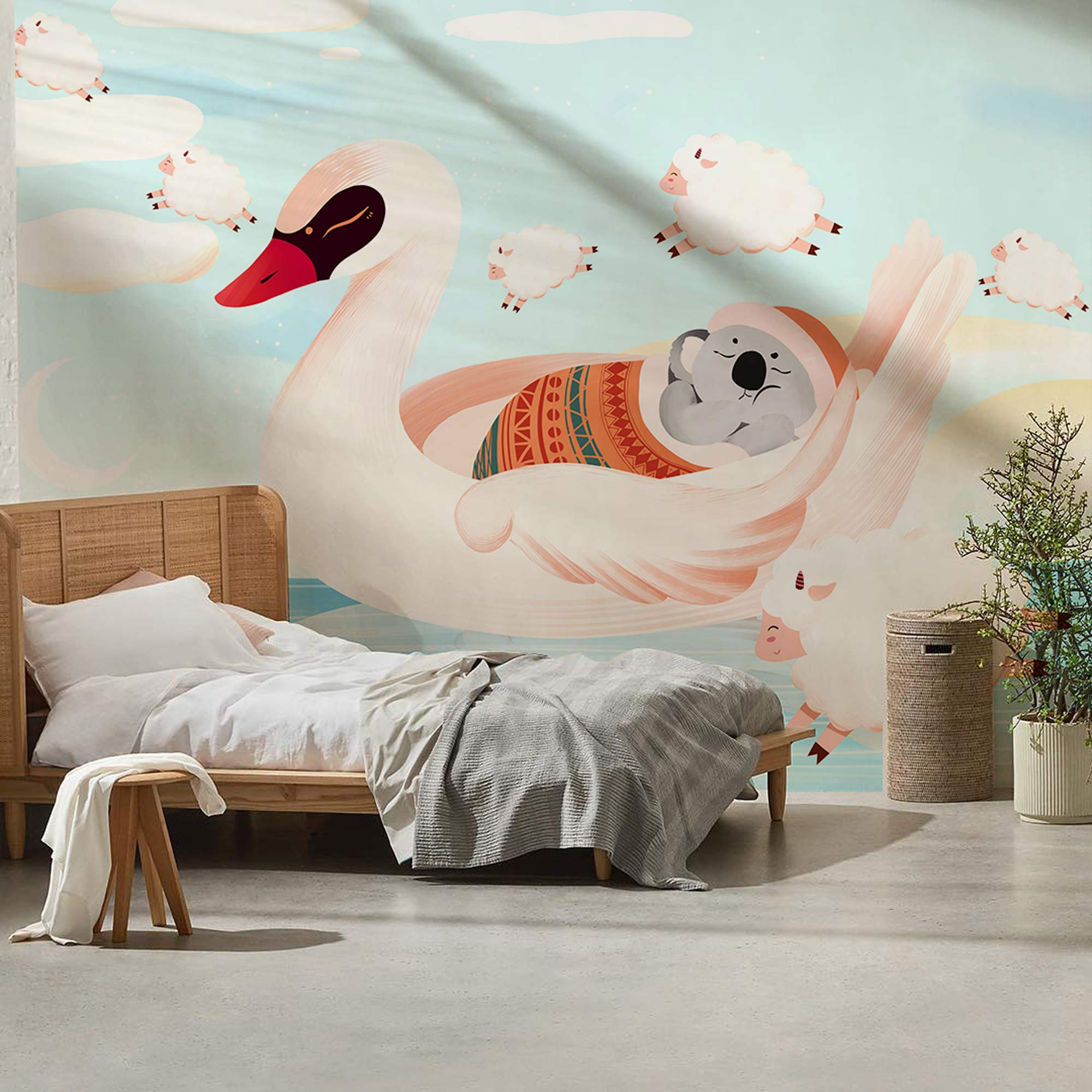 Jetez un œil à cet adorable papier peint avec un koala dormant dans un lit de cygne sur le lac, n'est-ce pas merveilleux! Peint avec des tons de rêve doux qui seront parfaits pour la chambre et la pépinière de vos enfants. Placez ce fond d'écran sur le mur qui est à côté de leur lit et profitez du sentiment paisible qu'il vous apporte, vous et vos enfants.