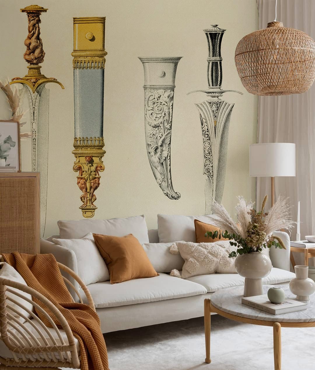 Montrez votre amour pour le genre fantastique avec ce papier peint panoramique Poignard et fourreau. Papier peint unique représentant des dagues et des fourreaux brillants et sophistiqués du 16e siècle, cette peinture murale s'adapterait parfaitement à un intérieur utilisant des couleurs comme l'or, le noir et le cuivre. Composée de détails précis et de couleurs vives, cette nouveauté murale ajoutera de la vie à n'importe quelle pièce de votre maison ou de votre bureau. Créez une touche vintage sur vos murs grâce au design artistique et aux dimensions profondes de ce revêtement mural contemporain et accrocheur.