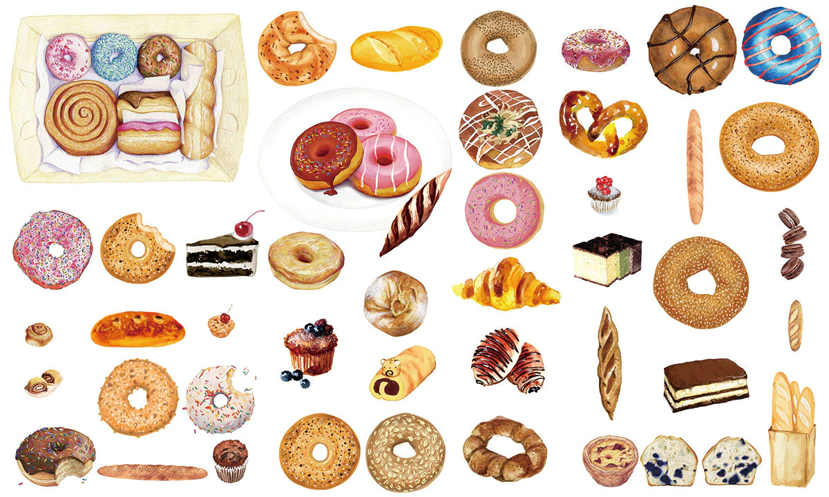 Il est temps d'obtenir votre salle à manger ou votre cuisine un nouveau look frais! Cette jolie collection de desserts, y compris le beignet, le croissant et le gâteau, est une murale murale parfaite qui stimulera votre appétit et est prêt à transformer l'espace ennuyeux en quelque chose d'unique et accrocheur. Pourquoi ne pas l'essayer et associez-vous à des décorations de maison modernes.