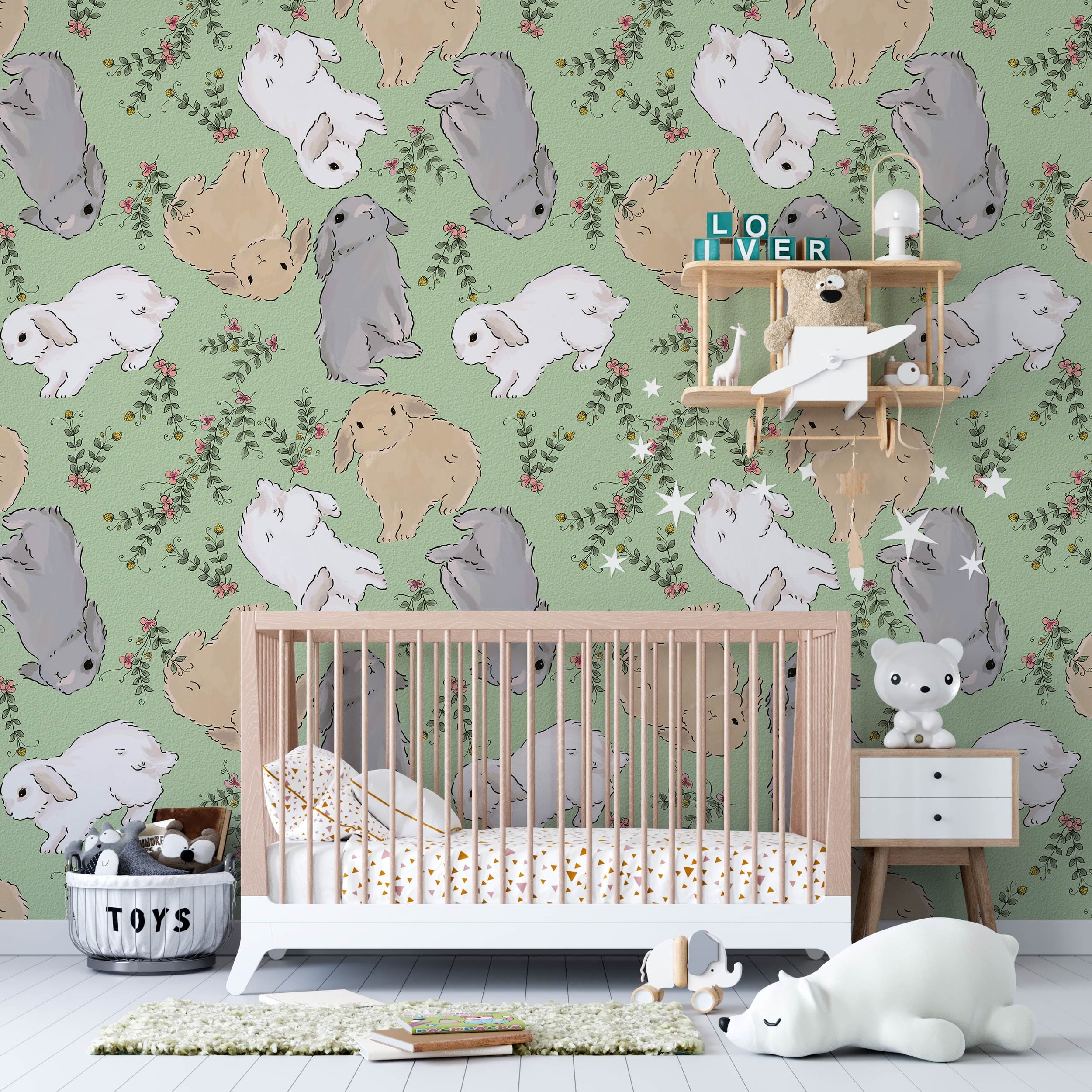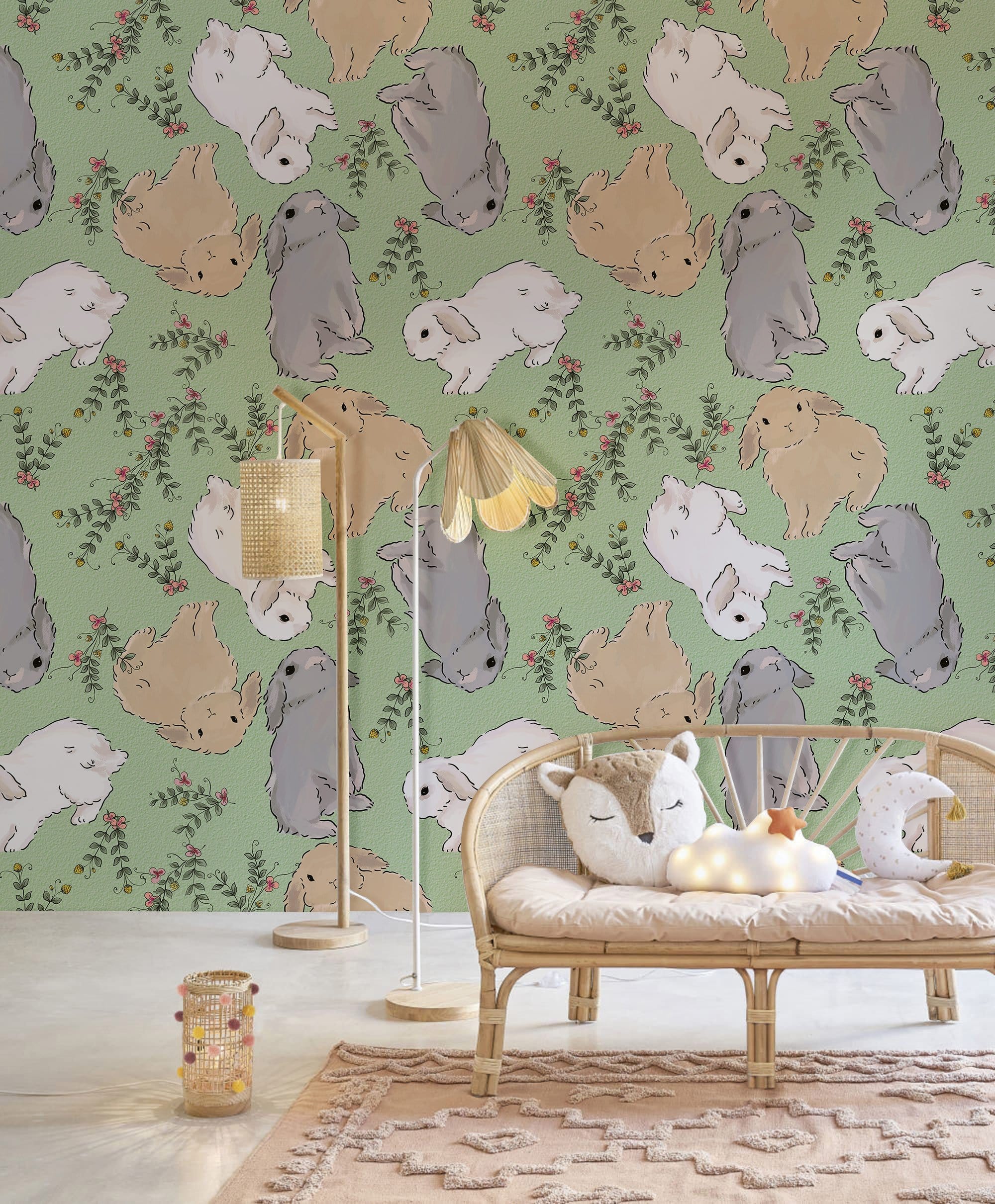 Inspirez vos enfants avec notre caricature de papier peint de lapin. Ce Ever Wallpaper est conçu dans des motifs répétés de lapins mignons et de feuilles vertes, qui met à cœur et peut apporter à l'espace intérieur un nouvel attrait. Fond mural parfait pour la chambre des enfants et la crèche pour réchauffer vos chambres.