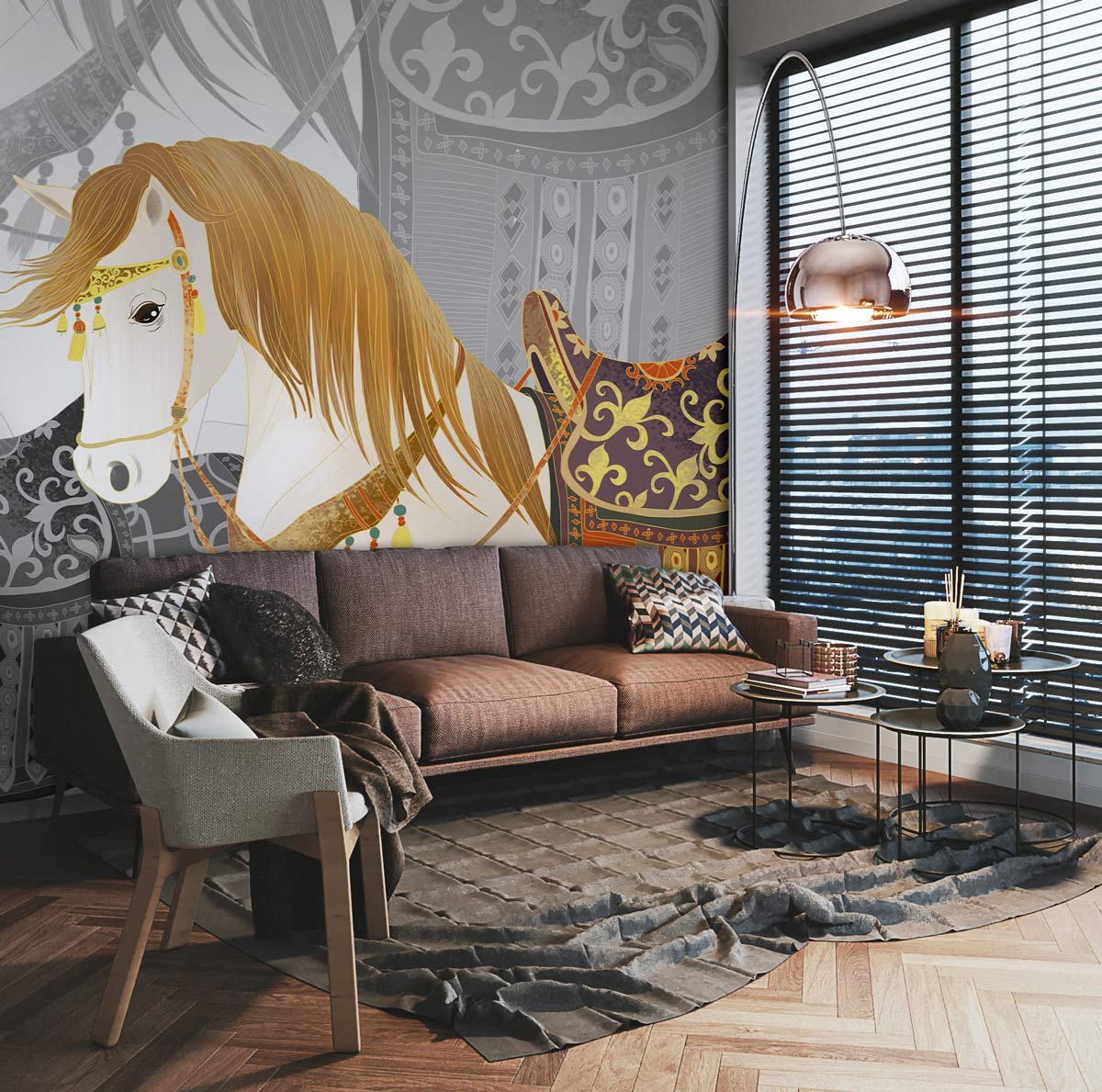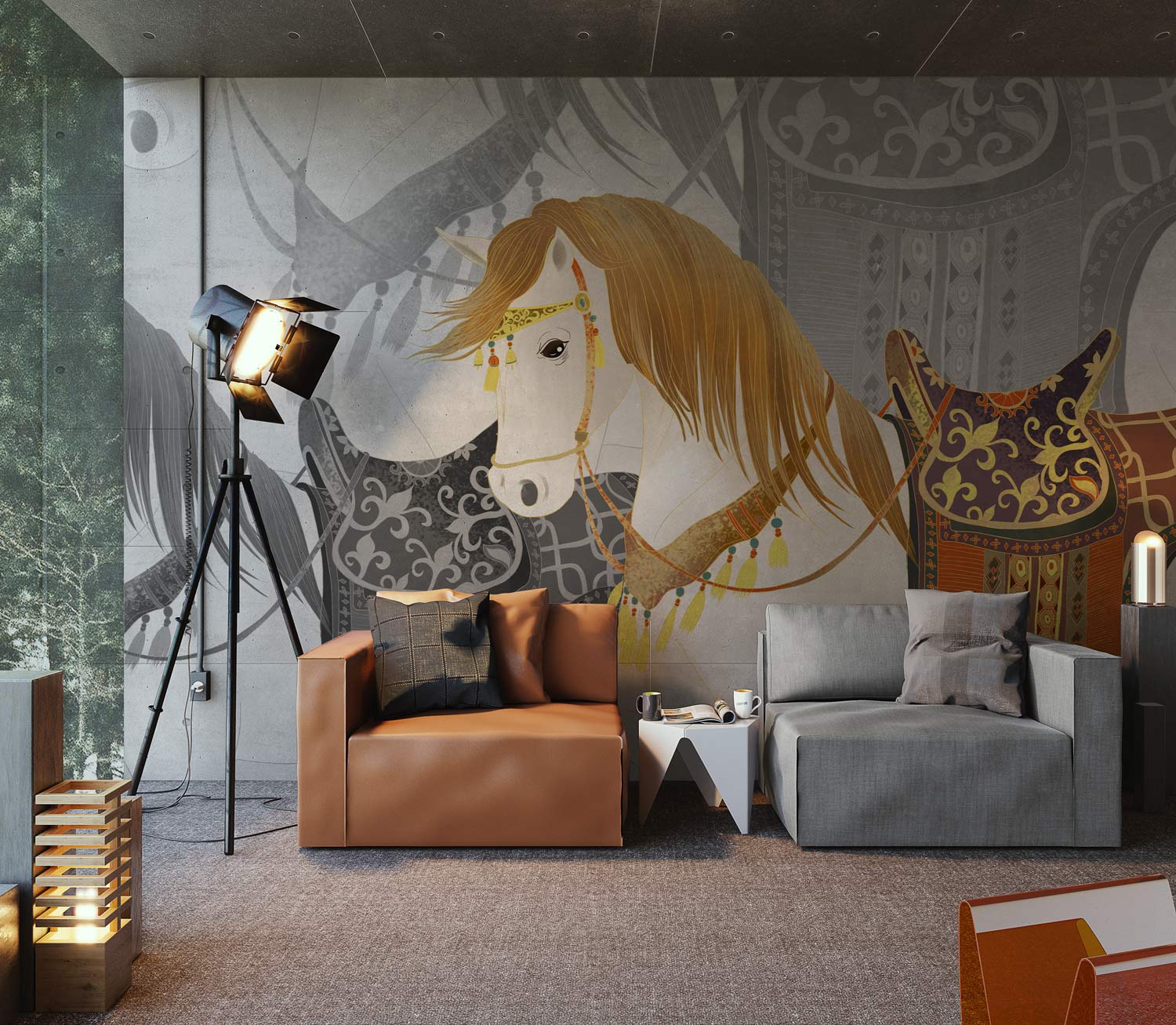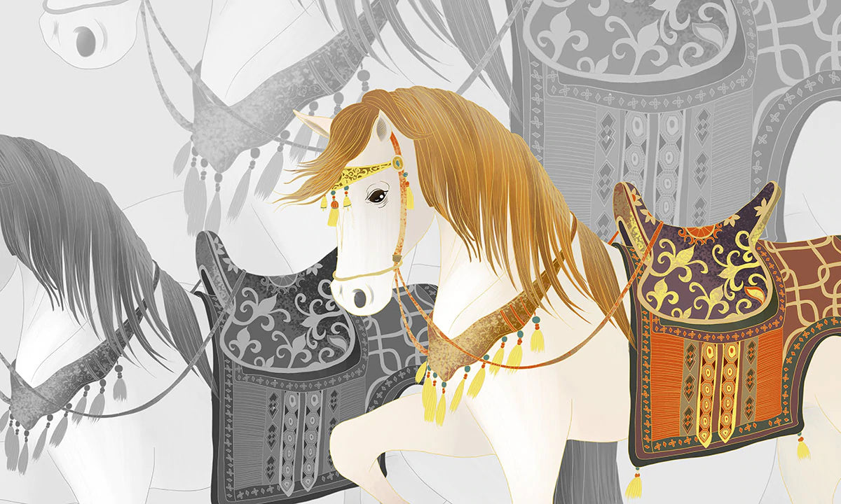 Cette peinture murale est un design peint à la main avec un élégant imprimé cheval sous un fond vert passal. Vous serez étonné de cette scène comme mur de fonctionnalités dans votre salon, votre chambre, votre salle à manger et votre couloir. Fonctionne parfaitement avec des décors et meubles de maison de style traditionnel ou moderne.