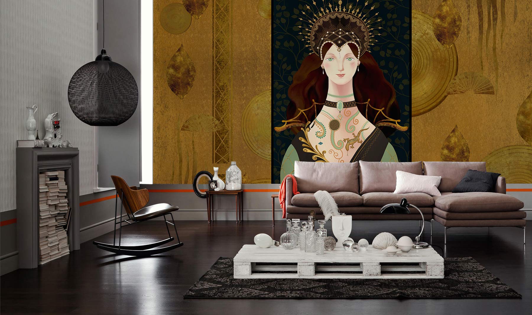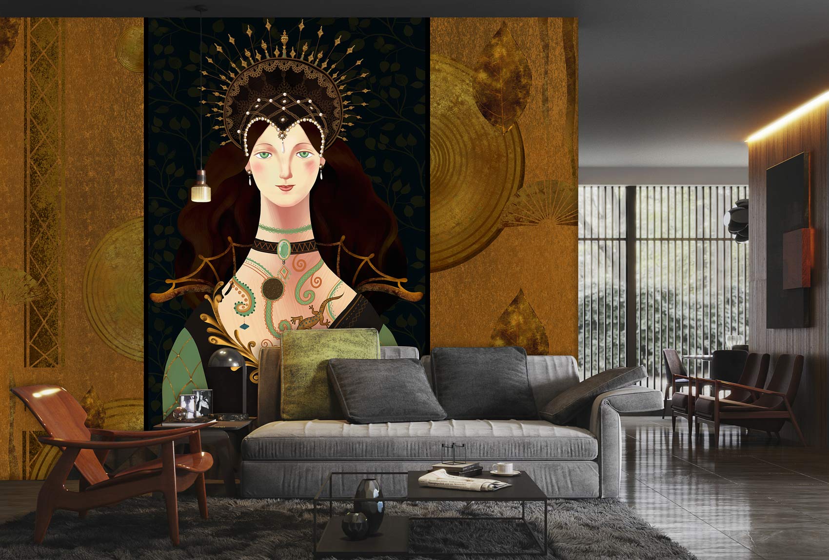 Ajoutez une touche de glamour à vos murs avec cette élégante murale de papier peint queen. Le fond jaune fané avec des feuilles, des ventilateurs et des cercles ensemble créent un look vintage mais élégant qui embellira instantanément vos murs avec sa simple grâce. Parfait pour associer vos meubles modernes dans votre salon, votre chambre et votre salle à manger.