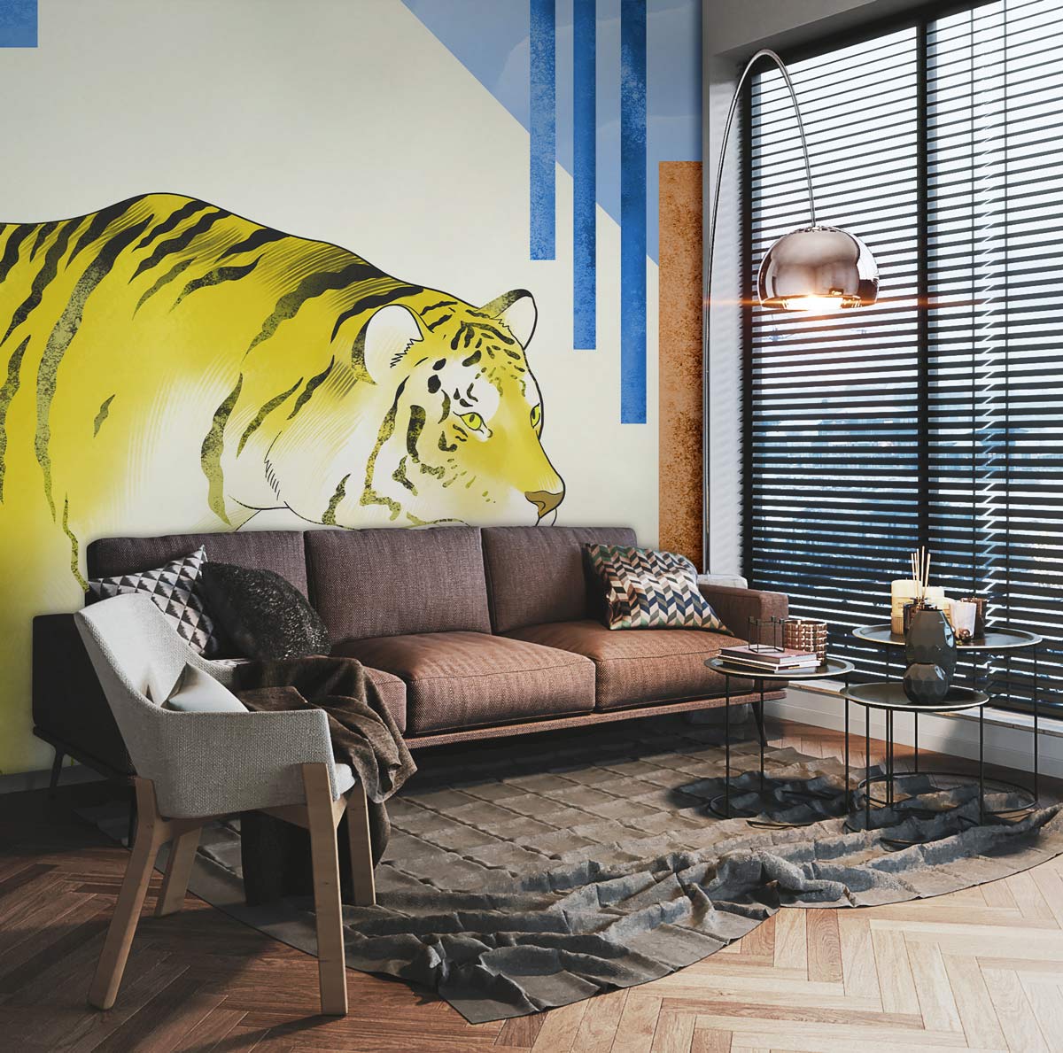 Créez un espace intérieur accrocheur avec cette belle murale de papier peint de tigre. Cet énorme motif de tigre utilise un design de style peint à la main vivant qui vous apportera sûrement un fort impact visuel. Pourquoi ne pas l'utiliser dans votre salon ou votre couloir pour un effet frappant et impressionner vos invités.