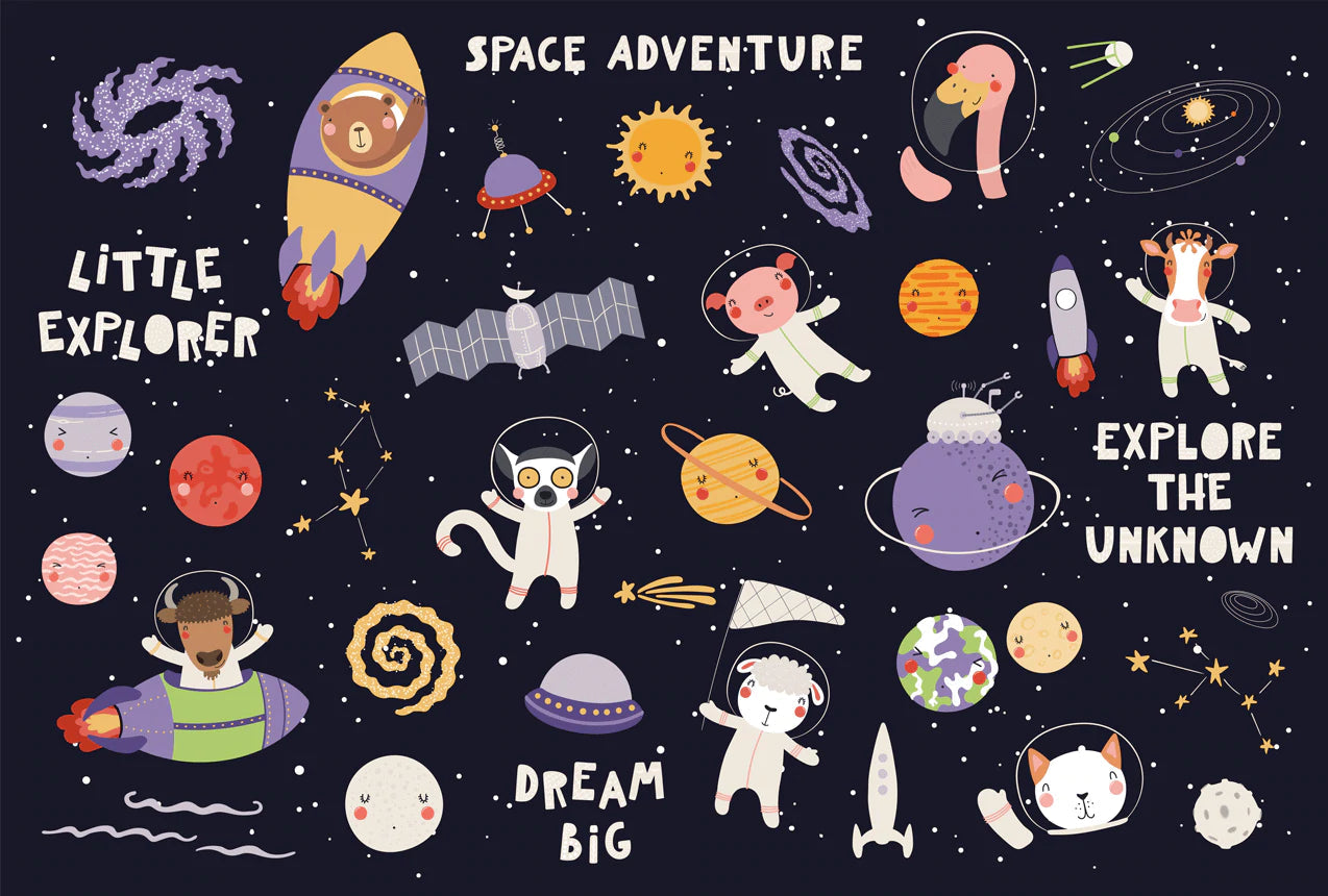 Créez un espace pour votre enfant qui montre son amour de toutes les choses hors de ce monde, avec ce dessin animé d'astronautes, de fusées, de planètes, d'étoiles et de papier peint OVNI. Le design présente un fond noir, complété par des images colorées, toutes étiquetées ajoutant à l'élément de curiosité.