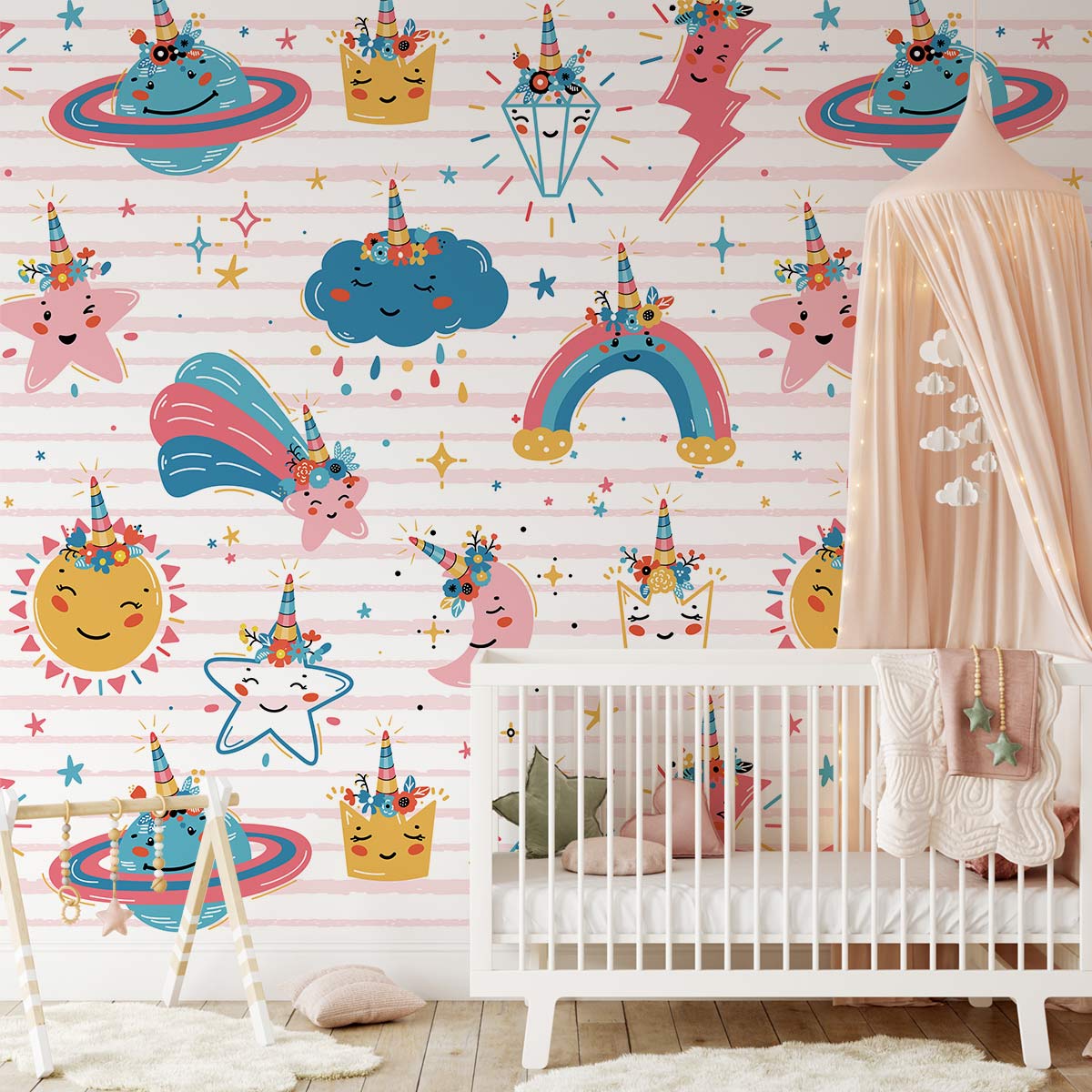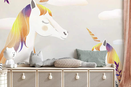 Surprenez vos enfants avec une nouvelle décoration de pièce et obtenez leur chambre de look ordinaire. Ce papier peint mural mural de licornes et de nuages magiques fera une pièce girly parfaite. Ce design rendra vos filles amoureuses de leur petit espace et auront des souvenirs très gentils et inoubliables avec la belle conception murale. Un très joli Ever Wallpaper Pinky Shades pour concevoir votre zone Kidsā €? À la Pour l'attention qui attire l'attention. Complétez le look avec des rideaux blancs en mousseline pour une pièce spéciale en vibrations et des nuances lite pour la rendre plus relaxante.