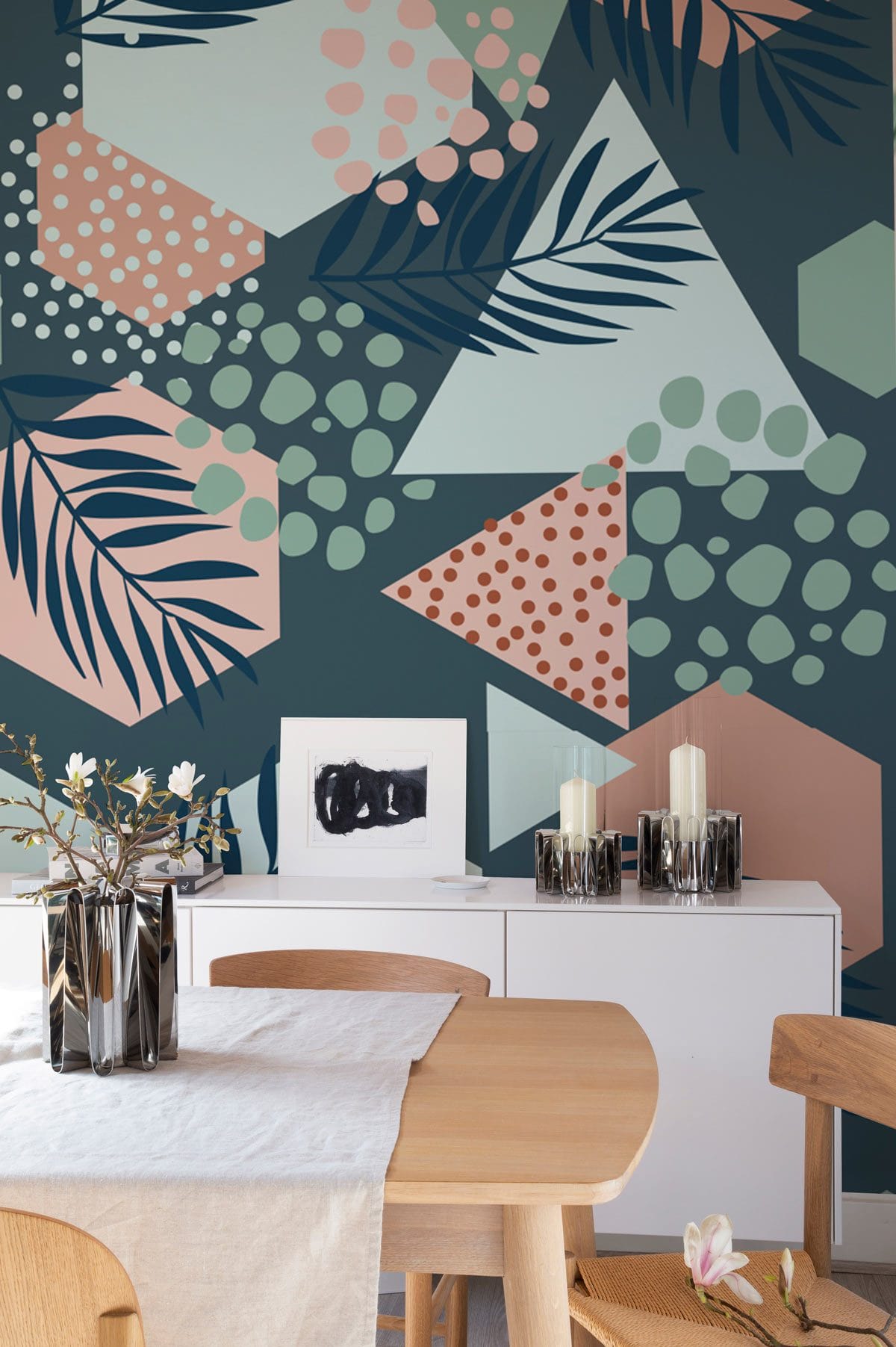 Donnez vie à votre mur avec cette belle peinture murale abstraite. Soulagez votre stress et profitez de la fraîcheur de ces feuilles dans des couleurs pastel douces. Les blocs de couleur géométrique sont puissamment unis aux feuilles mais pas trop écrasantes. Ajoutez une atmosphère paisible et calme à votre salon, salle de bain, chambre à coucher et salle à manger avec cet art déco. Travaillez parfaitement à vos meubles de style moderne et à vos décors de maison.