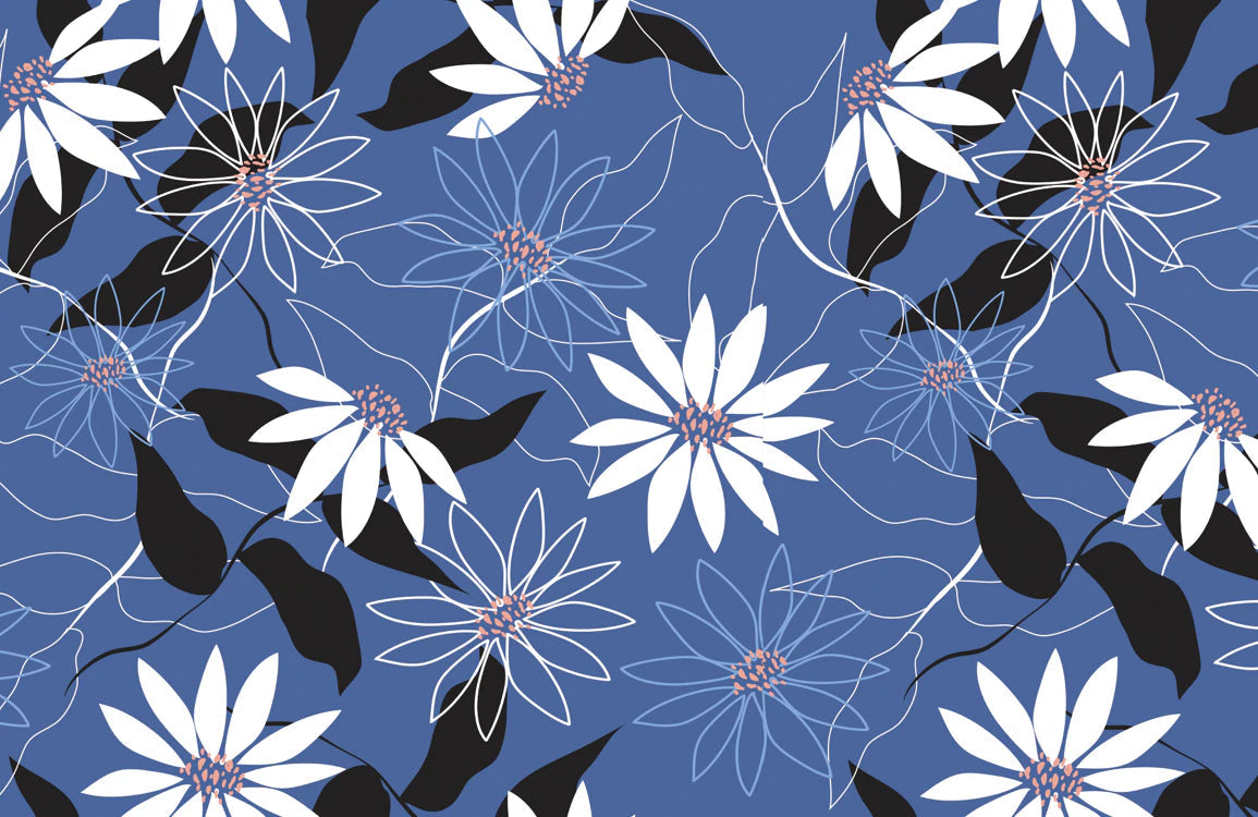 Ajoutez un glamour instantané à vos intérieurs avec ce papier peint à fleurs. La fleur blanche et les feuilles noires se combinent sous un doux ton bleu marine pour un look confortable et attrayant à votre espace. Art déco idéal pour vos murs de salon, chambre et salle à manger.