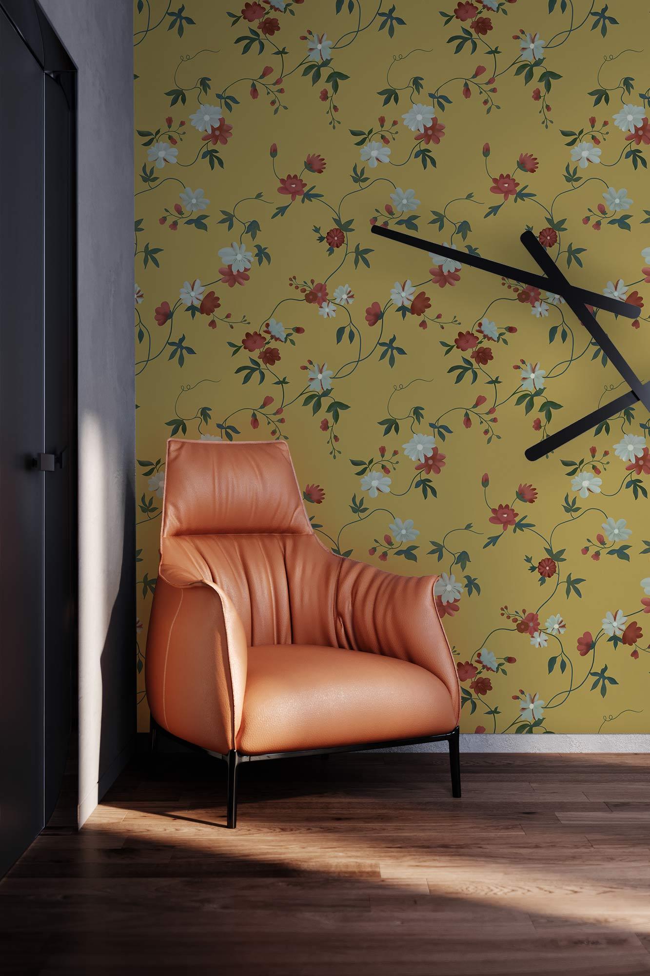 Embellissez votre maison avec cette petite fleur de fleur peint mural. Cette conception en arrière-plan jaune foncé avec des vignes fleuries rampant sur vos murs ajoutera instantanément plus de fraîcheur à vos chambres. Associez-le avec des meubles traditionnels et des décors de maison pour un look charmant à vos intérieurs.
