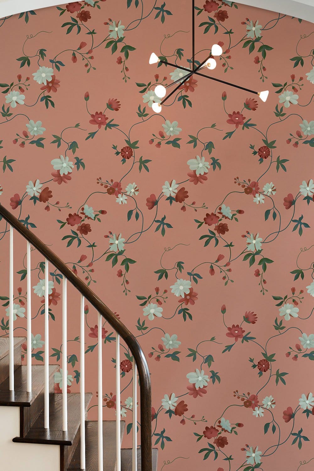 Embellissez votre maison avec cette petite fleur de fleur peint mural. Cette conception en arrière-plan rose corail avec des vignes fleuries rampant sur vos murs ajoutera instantanément plus de fraîcheur à vos chambres. Associez-le avec des meubles traditionnels et des décors de maison pour un look charmant à vos intérieurs.