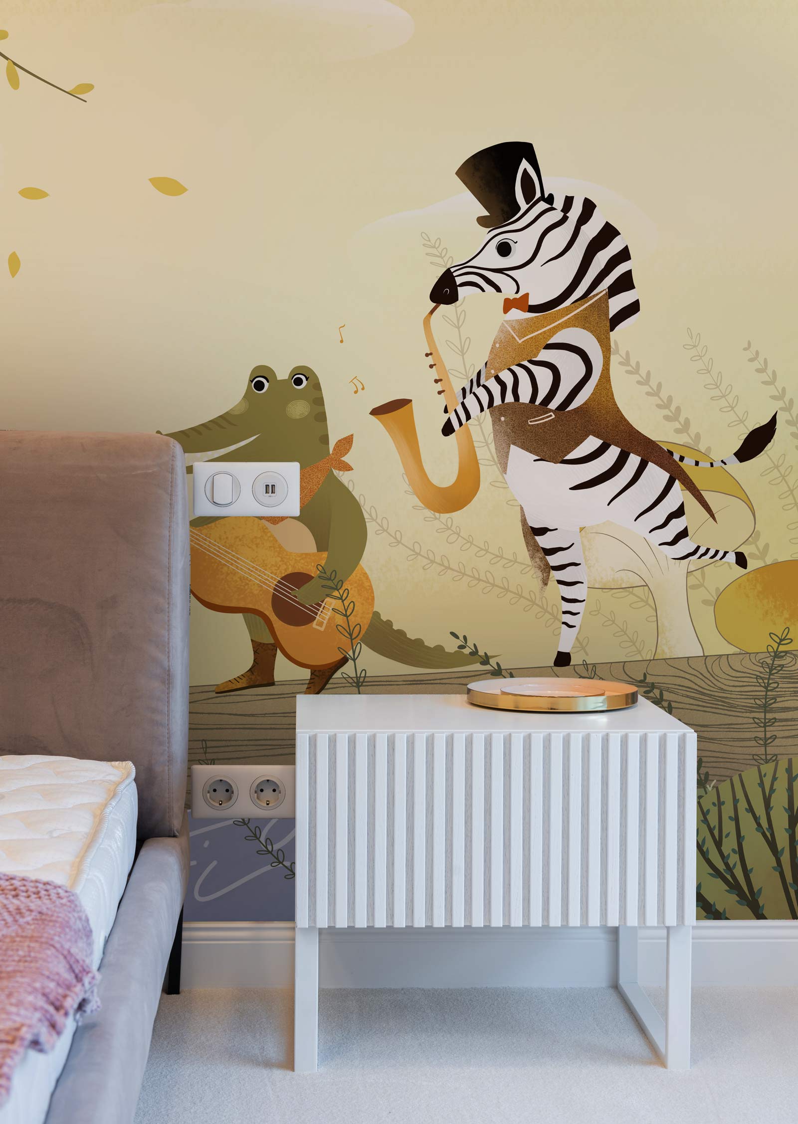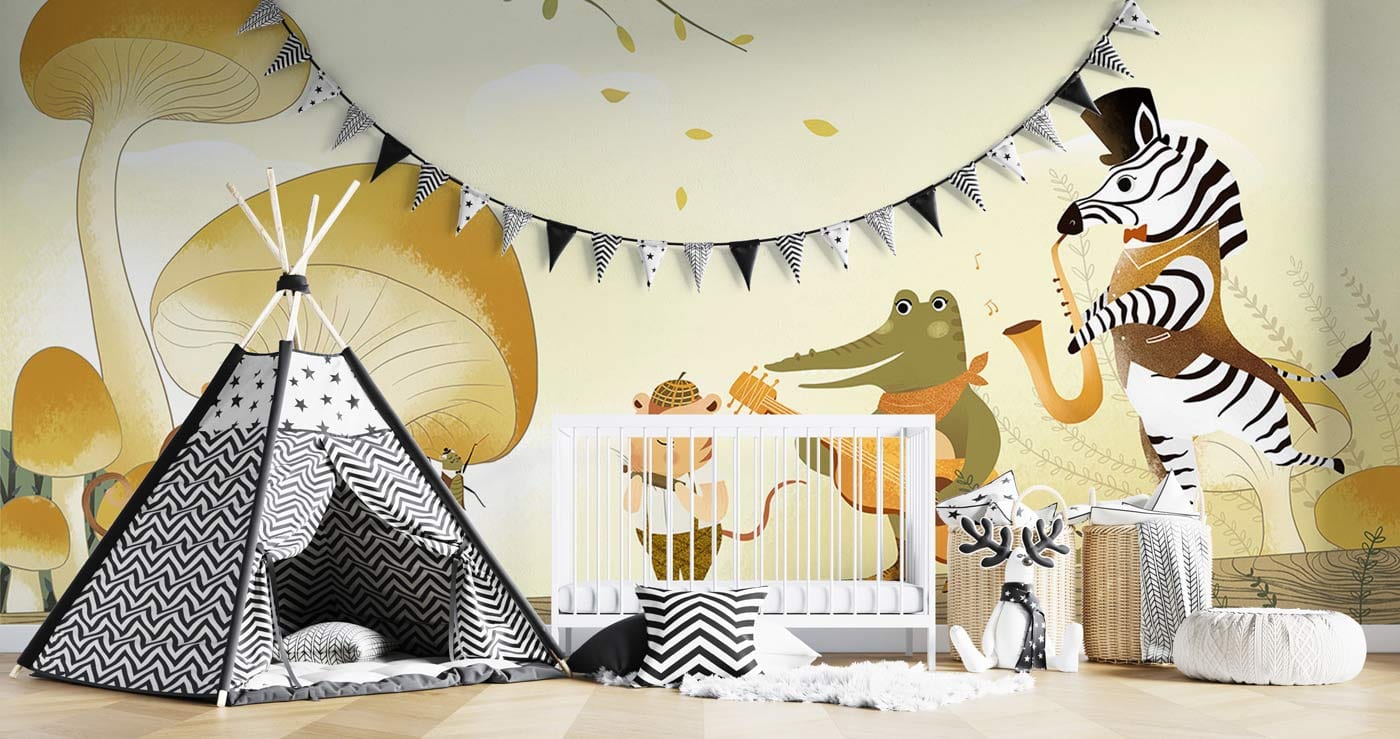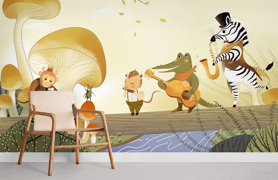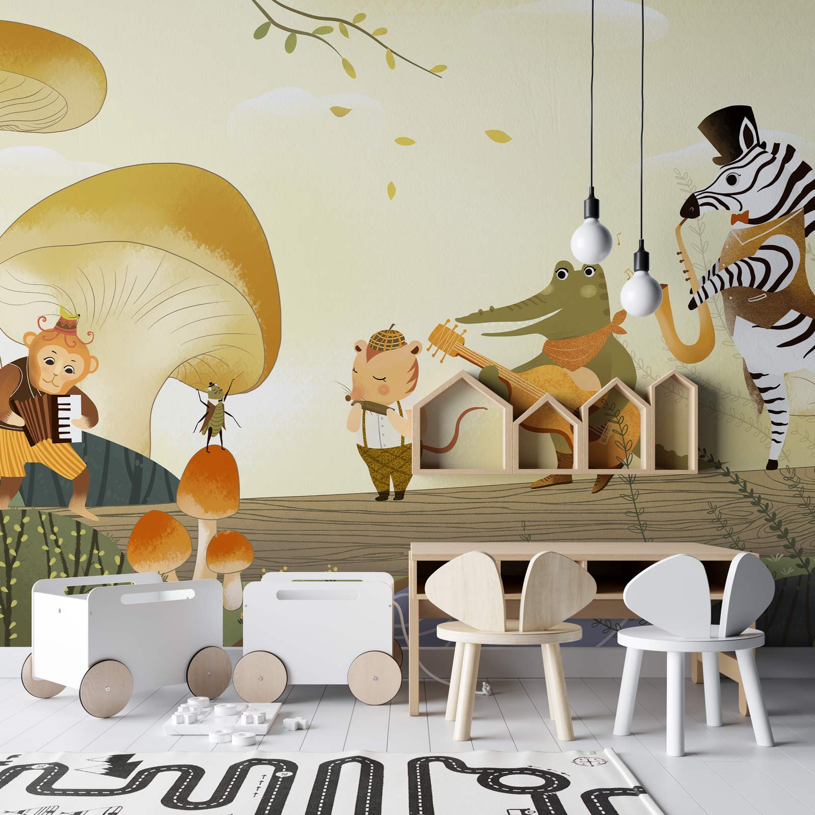 Profitez d'un merveilleux concert de musique dans votre maison avec cette murale de papier peint. Doté d'un groupe d'animaux mignon tenant un concert dans la forêt de champignons, cette adorable peinture attrayante est la création de cœur et sera parfaite pour la chambre et la salle de jeux de votre enfant. Rendu intéressant avec une atmosphère naturelle et une décoration murale rafraîchissante parfaite pour vos enfants.