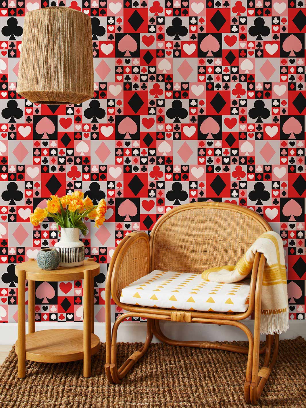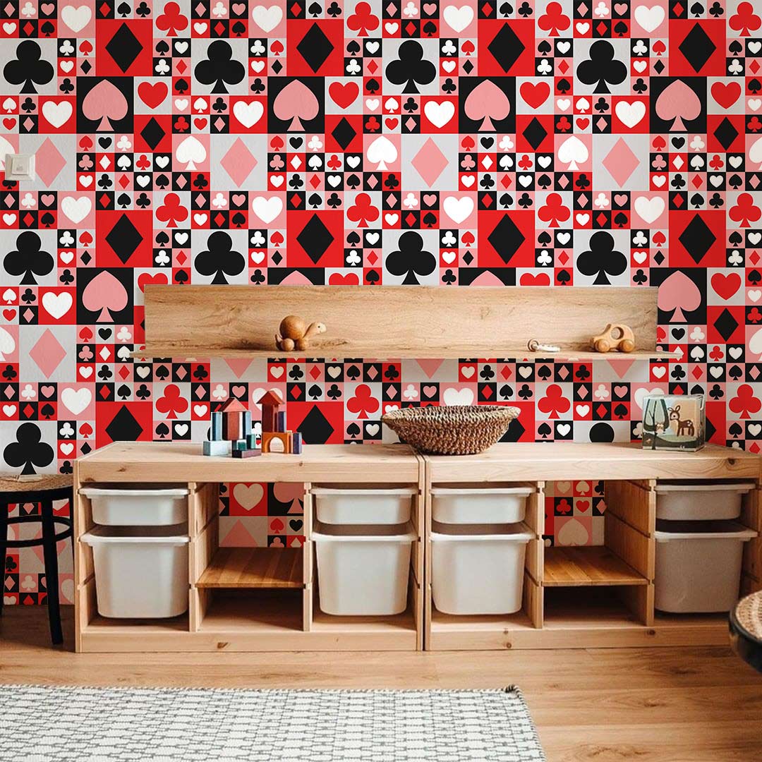 Si vous aimez les sensations fortes du poker, alors ce papier peint mural Poker Flash est exactement ce qu'il vous faut. Ce motif ludique présente une série de cartes à jouer sur un fond énergique qui fera ressortir vos murs. Facile à installer et à enlever sans laisser de résidus collants, la peinture murale est un moyen créatif d'ajouter de l'intérêt à un espace. C'est le motif parfait pour la chambre de votre enfant ou la salle de jeux, mais il apporte également une touche de personnalité à toute autre pièce de votre maison.