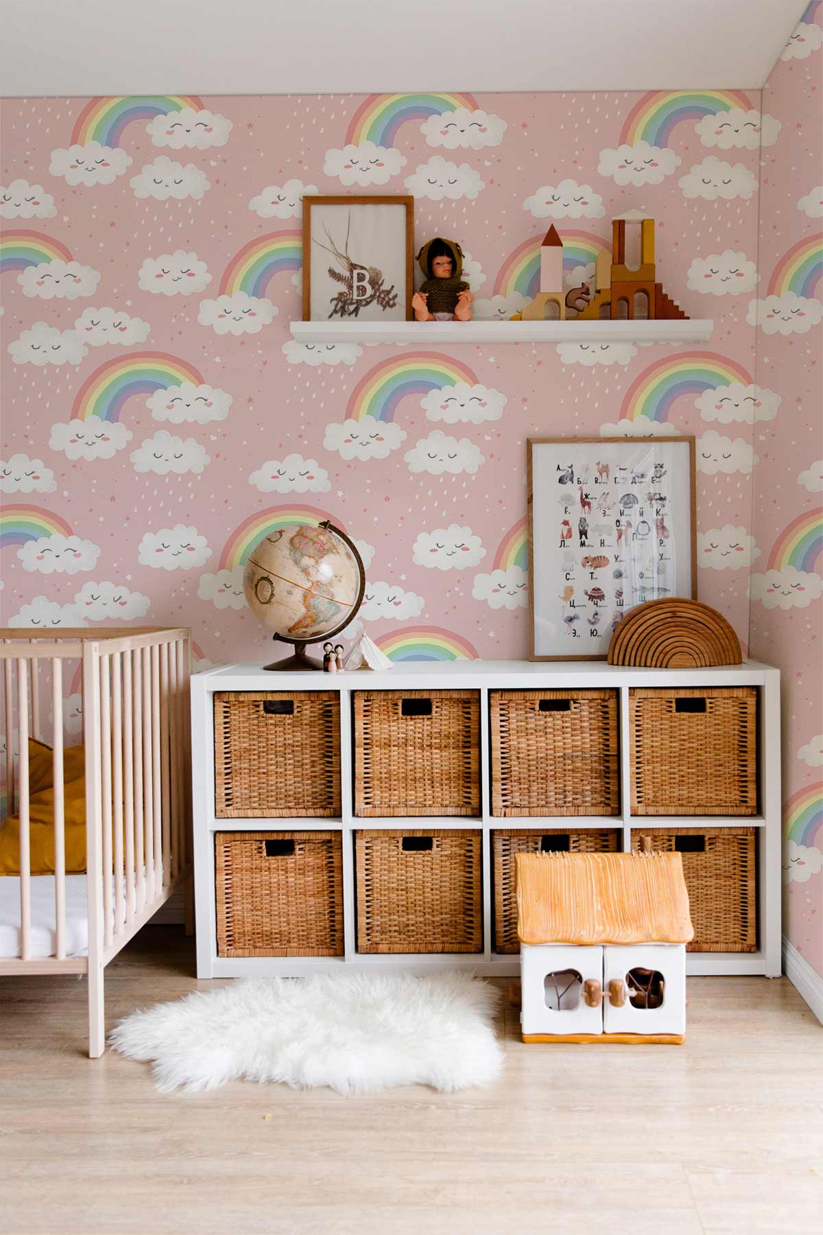 Décorez votre fondère peint pour la chambre Avec cette conception de papier peint mural vibrant des nuages et arc-en-ciel et les rendre heureux et attachés à leur chambre inhabituelle. Le design est si mignon et brillant et rendra la pièce pleine d'énergie et de bonheur. Cette conception est si parfaite pour les deux kids et aussi pour la configuration de la salle de nouveau-née. Essayez d'utiliser des décorations lite avec cette murale pour un look lumineux et fluide, alors utilisez des rideaux blancs en mousseline et des décorations blanches et un tapis rose pour un joli thème girly.