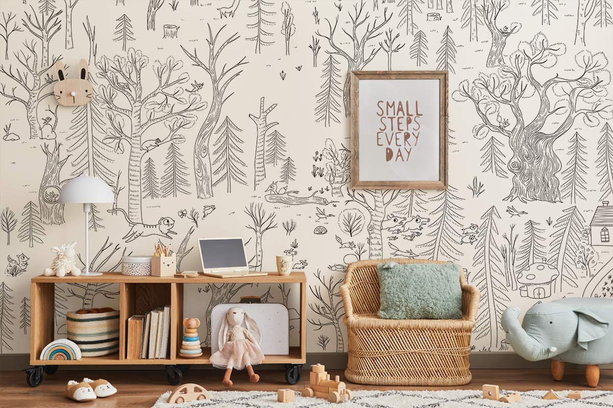 Vos enfants vont adorer ce papier peint mural. Plein d'animaux sauvages mignons comme le renard, le raton laveur, le lapin et l'écureuil ayant une merveilleuse fête dans la forêt. Cette peinture adorable et attrayante fait fondre le cœur et sera parfaite pour la chambre et la salle de jeux de votre enfant. Rendu intéressant avec une ambiance naturelle et une décoration murale rafraîchissante parfaite pour vos enfants.
