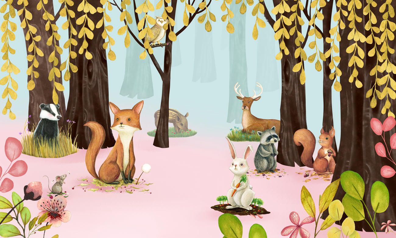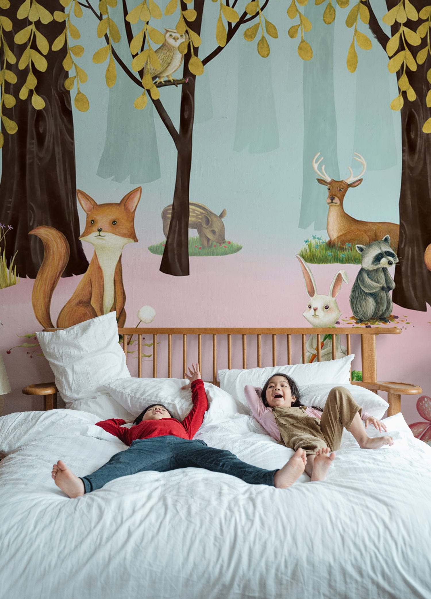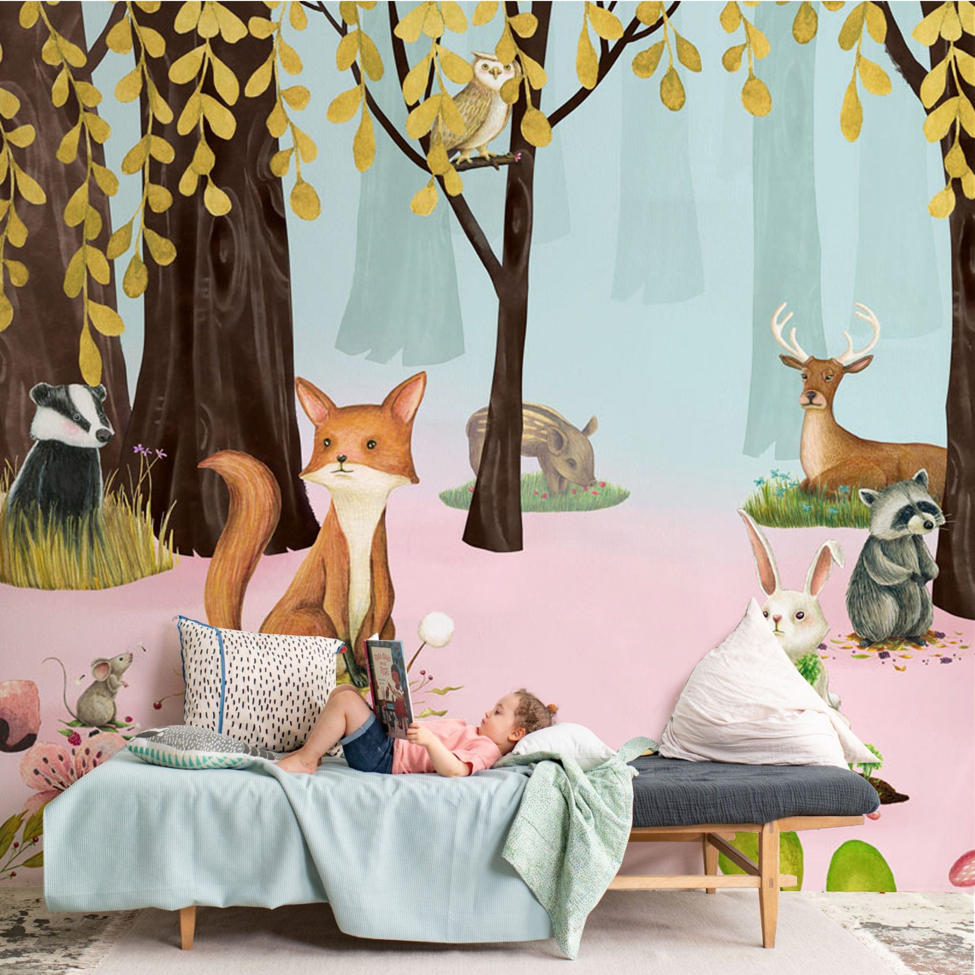 Vos enfants vont adorer ce papier peint mural. Plein d'animaux sauvages mignons comme le renard, le raton laveur, le lapin et l'écureuil ayant une merveilleuse fête dans la forêt. Cette peinture adorable et attrayante fait fondre le cœur et sera parfaite pour la chambre et la salle de jeux de votre enfant. Rendu intéressant avec une ambiance naturelle et une décoration murale rafraîchissante parfaite pour vos enfants.