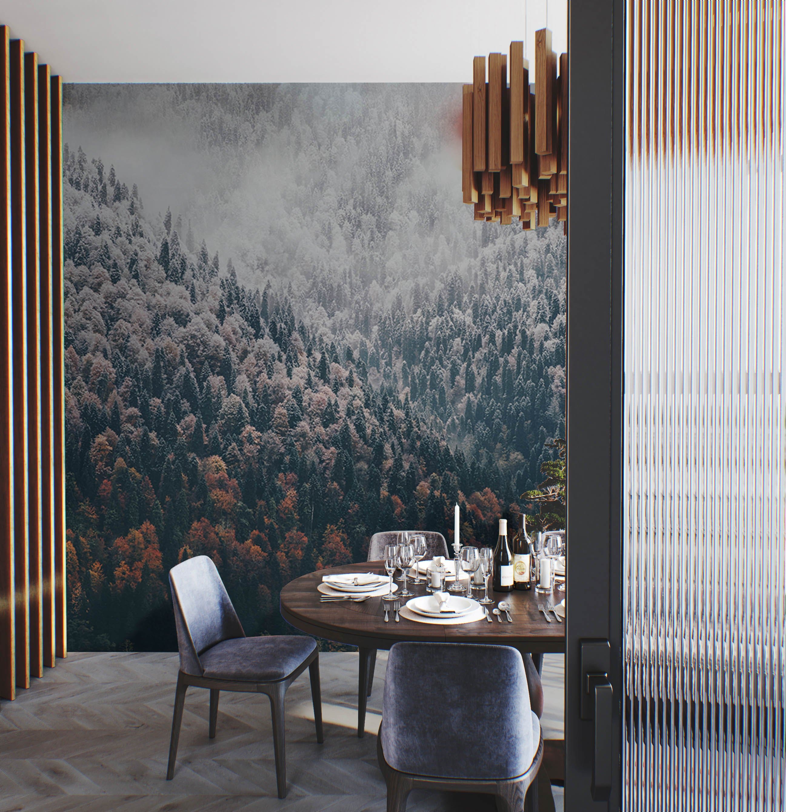 Si vous cherchez à créer un sentiment ultime de sérénité et de calme dans n'importe quelle pièce, notre papier peint mural dans les bois est un moyen idéal pour vous évader dans la nature au sein de votre maison. Cette magnifique peinture murale boisée représente une forêt verdoyante voilée de brume et serait l'élément paisible parfait dans votre chambre à coucher. Associez cette peinture murale d'arbres forestiers de rêve à un décor en bois ou en métal et à une palette de couleurs minimale inspirée de la nature pour créer un espace unique qui permettra à votre maison de devenir enfin le sanctuaire serein qu'elle devrait être.