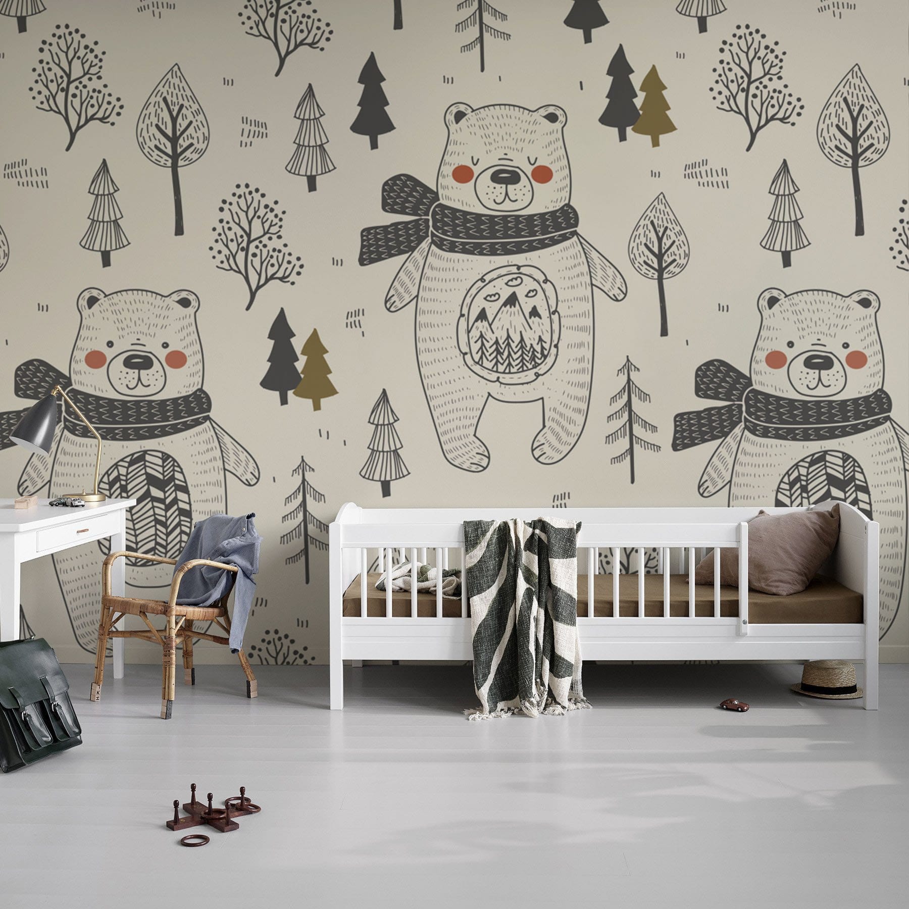 Vos enfants vont adorer notre peinture murale. Cet ours mignon dessiné à la main dans le motif de la forêt avec une murale de fond de couleur blanche crémeuse sous le cœur est en train de mentent le cœur et sera parfait pour la chambre et la salle de jeux de votre enfant. Rendu intéressant avec une atmosphère charmante et heureuse et une décoration murale rafraîchissante parfaite pour vos enfants.