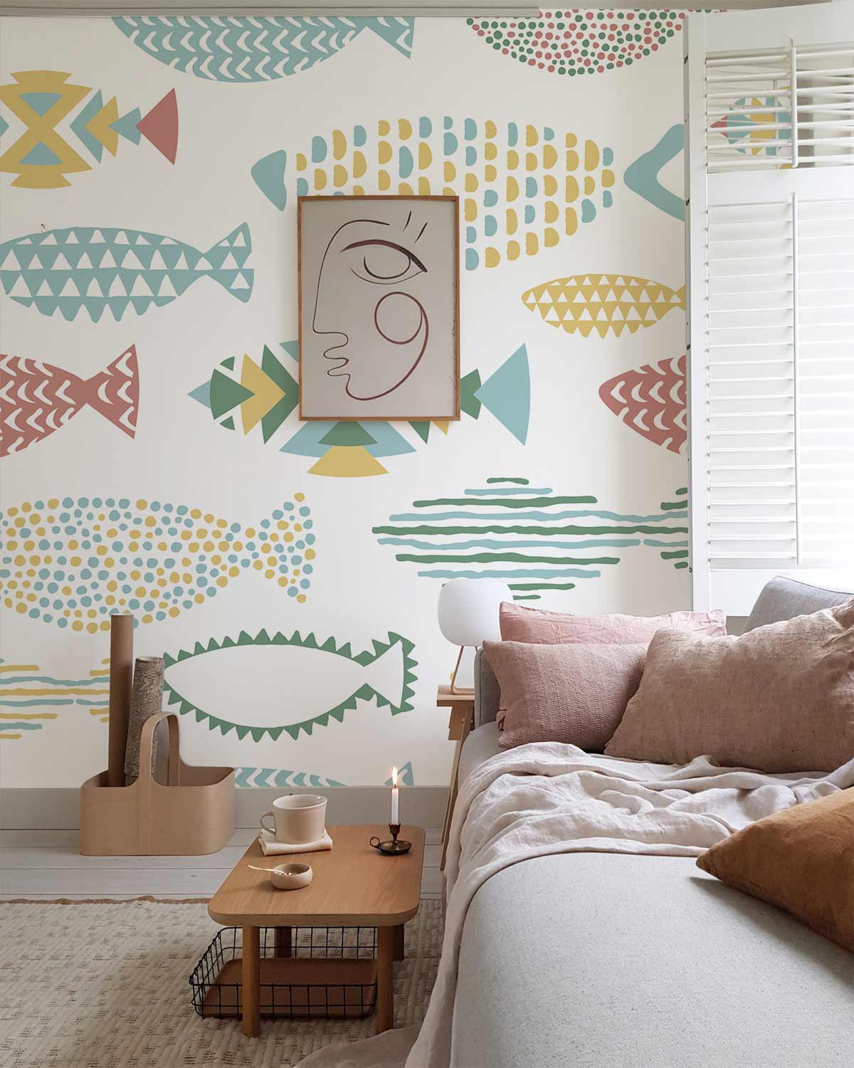 Cette murale de poisson donnera à votre maison une sensation boho. L'une des caractéristiques du design boho est la combinaison de couleurs plongeantes et de l'esquisse apparemment aléatoire mais réaliste. Ne laissez pas ce goût glisser dans votre maison et le garder aussi contemporain que possible. Sur un fond blanc crémeux, les teintes pastel impriment bien, créant une atmosphère vibrante et paisible. Vous pouvez choisir n'importe quelle couleur de meubles pour correspondre au papier peint de votre maison. Même dans un salon avec des canapés natures ou une salle à manger ou une chambre avec un décor plus orné, cette murale de poisson offrira une saveur de poisson excentrique à l'espace.
