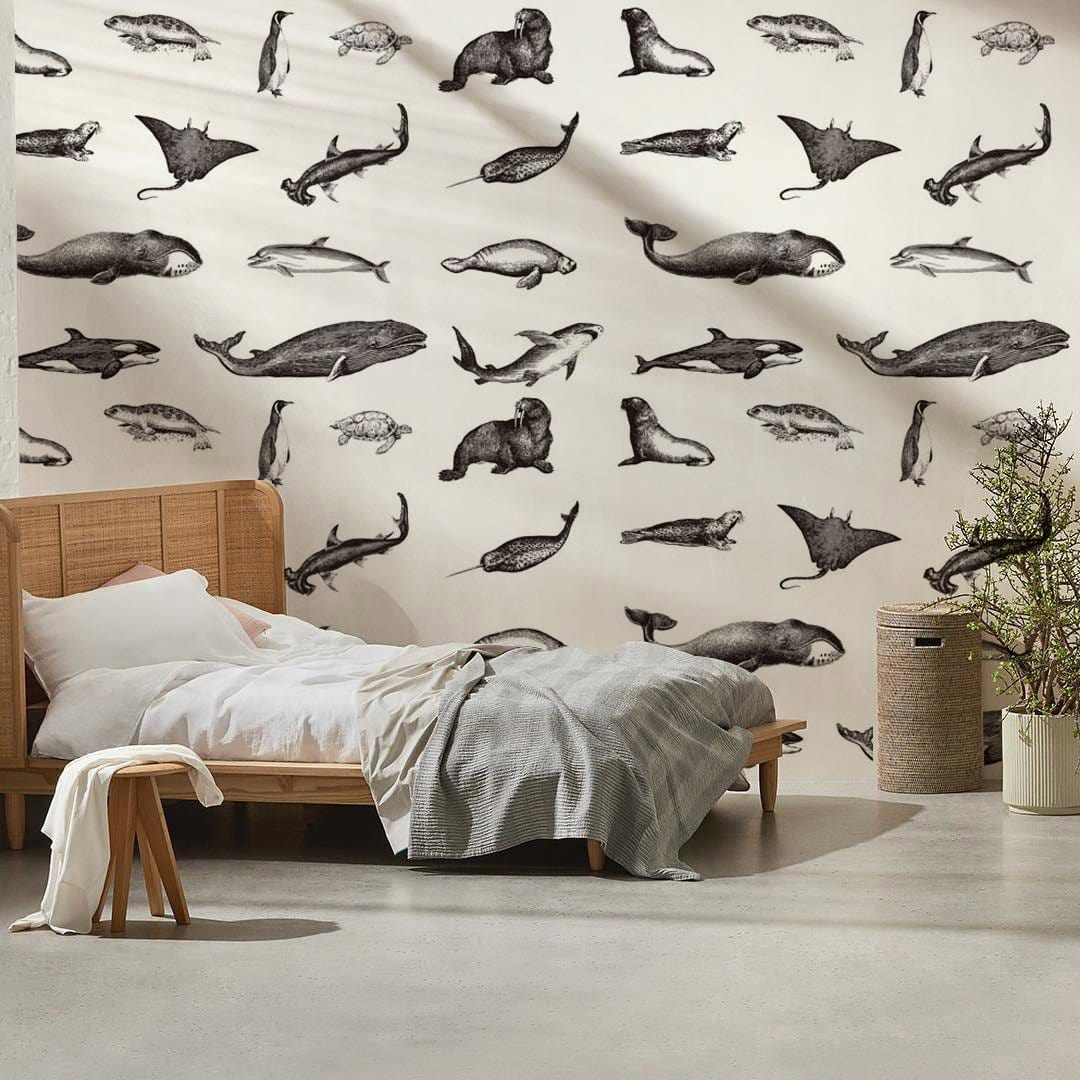 Si vous aimez les animaux de mer, alors vous allez adorer cette peinture murale! Cette murale de papier peint avec un nombre de beaux noirs dessinés à la main & amp; Les animaux de mer blanc comme les requins, le lion de mer et le sceau en noir réorganiseront sûrement votre espace!