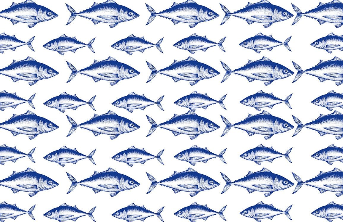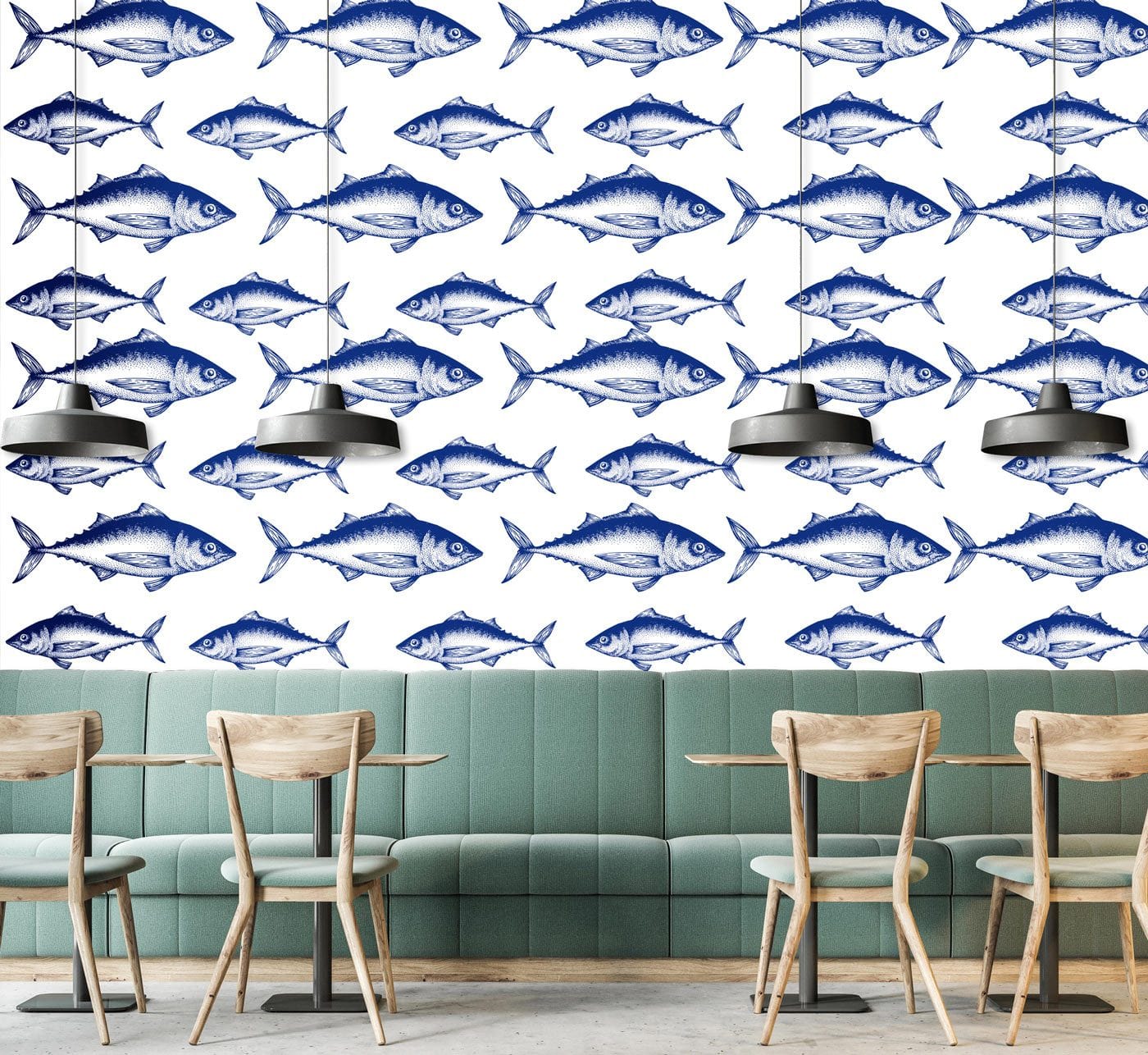 Si vous aimez le poisson de mer, alors vous allez adorer cette murale de papier peint! Cette murale de papier peint avec un motif répété de beaux poissons hippies bleus dessinés à la main, réorganisera sûrement votre espace! Grand Ever Wallpaper pour votre salon et votre chambre pour un look cool et unique.