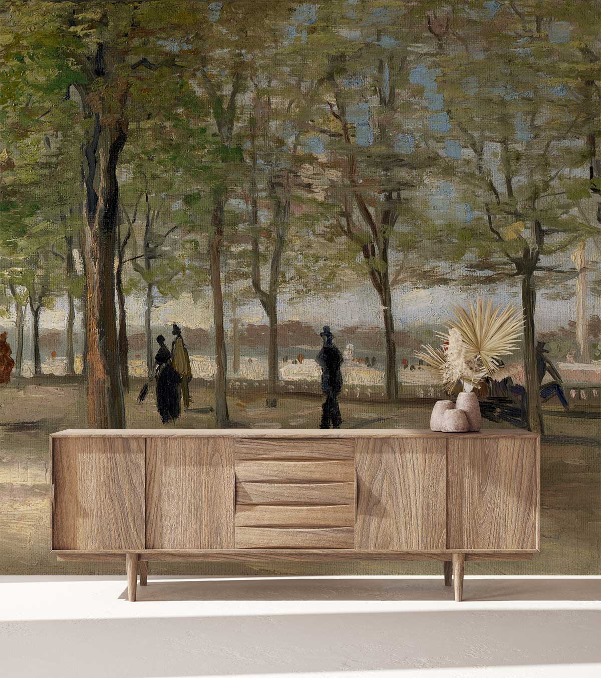 Notre papier peint panoramique Terrasse du Jardin est une belle façon d'allier nature et style dans votre maison. Reprenant la scène étonnante inspirée à l'origine par le tableau de Van Gogh en 1886, cette magnifique peinture murale représente des personnes se promenant dans le célèbre jardin du Luxembourg. Composée de nuances soigneusement peintes et de détails complexes, cette peinture murale vous épatera certainement par ses couleurs intenses et son aura apaisante. Transformez les murs de votre chambre en une oasis de verdure tout en créant un drame artistique.