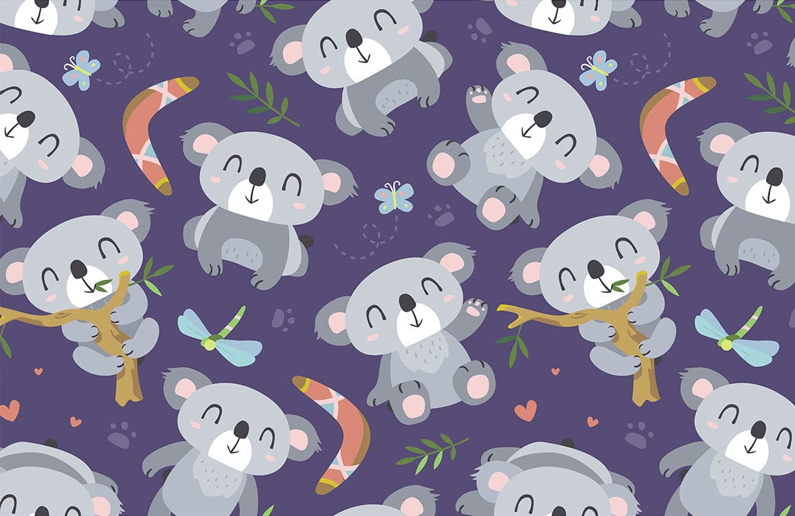 Vos enfants vont adorer ce mignon papier peint mural Koala à motif d'activités heureuses ! Cet adorable dessin animé Koalas imprimé mural fond de couleur violette convient à toutes les chambres d'enfants et de bébés, en particulier pour les filles et les nouveaux-nés. Placez ces koalas heureux muraux à votre mur et profitez du bonheur et de la joie qu'il apporte à vous et vos enfants.
