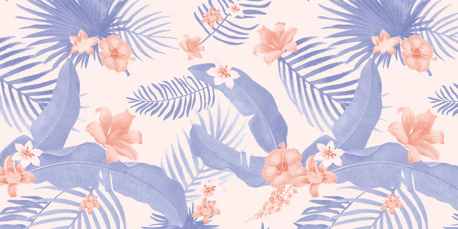 Profitez des douces feuilles tropicales violettes & papier peint fleurs roses. La conception rassemble des feuilles & des motifs de fleurs avec un fond rose pastel pour aider à donner vie à la peinture murale. Ce design tendance combine la beauté de l'art avec les motifs de feuilles tropicales pour apporter une touche élégante à votre espace. Cette décoration murale s'accordera parfaitement avec vos meubles blancs ou d'autres couleurs claires et toutes autres décorations d'intérieur.