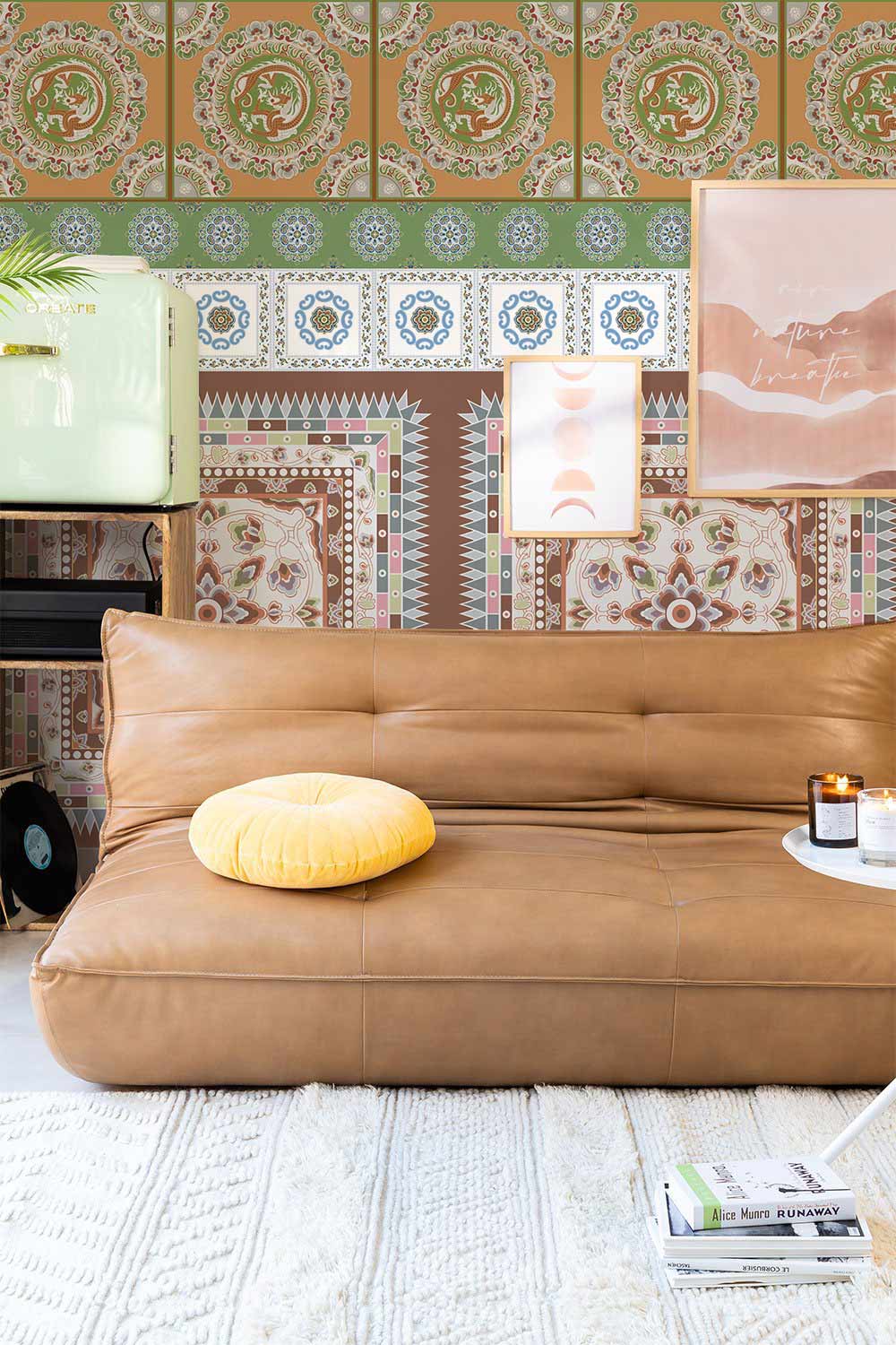 Avec un effet de carrelage au sol, ce mélange coloré de papiers peints muraux est parfait pour votre maison au style marocain moderne et artistique. Appréciez les nuances pastel et la transition entre l'orange et le vert et le marron qui feront un joli contraste et rendront l'endroit si chaleureux et très orienté avec les petits détails qui décorent le design complet. Décorez l'endroit avec des meubles simples pour qu'il n'y ait pas de surcharge.