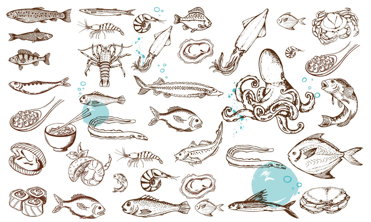 Si vous aimez les poissons de mer, alors vous allez adorer ce papier peint mural ! Cette murale en papier peint représentant un grand nombre de beaux poissons de mer dessinés à la main et d'autres animaux tels que des crabes, des pieuvres et des homards, va sûrement réorganiser votre espace ! Excellent papier peint pour votre salon et votre chambre pour un look cool et unique.