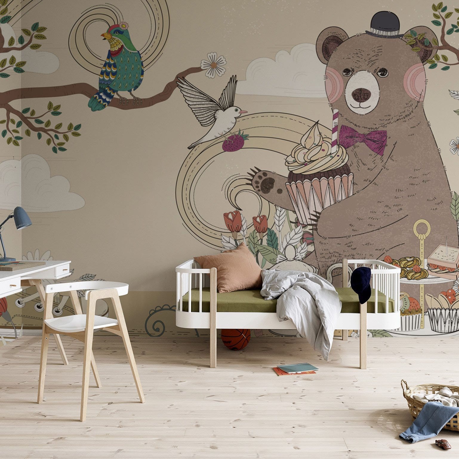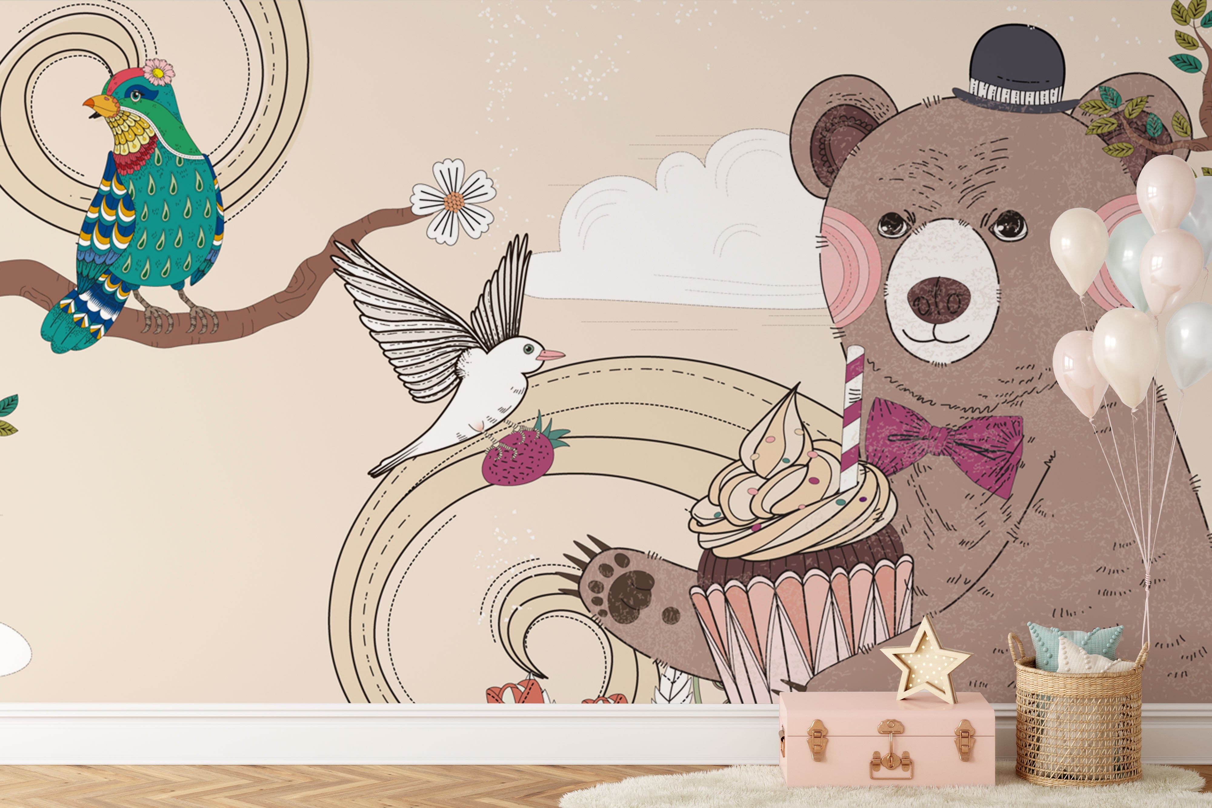 Vos enfants vont adorer ce papier peint mural. Cet adorable ours profitant d'un merveilleux goûter dans la forêt fait fondre le cœur et sera parfait pour la chambre et la salle de jeux de votre enfant. Un rendu intéressant avec une ambiance charmante et joyeuse et une décoration murale rafraîchissante parfaite pour vos enfants. Papier peint mignon perle pour chambre d'enfant