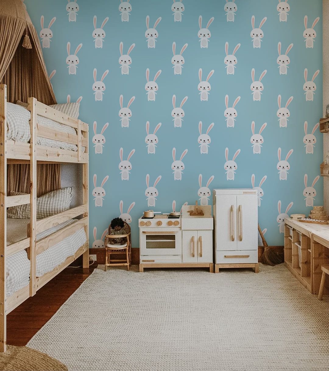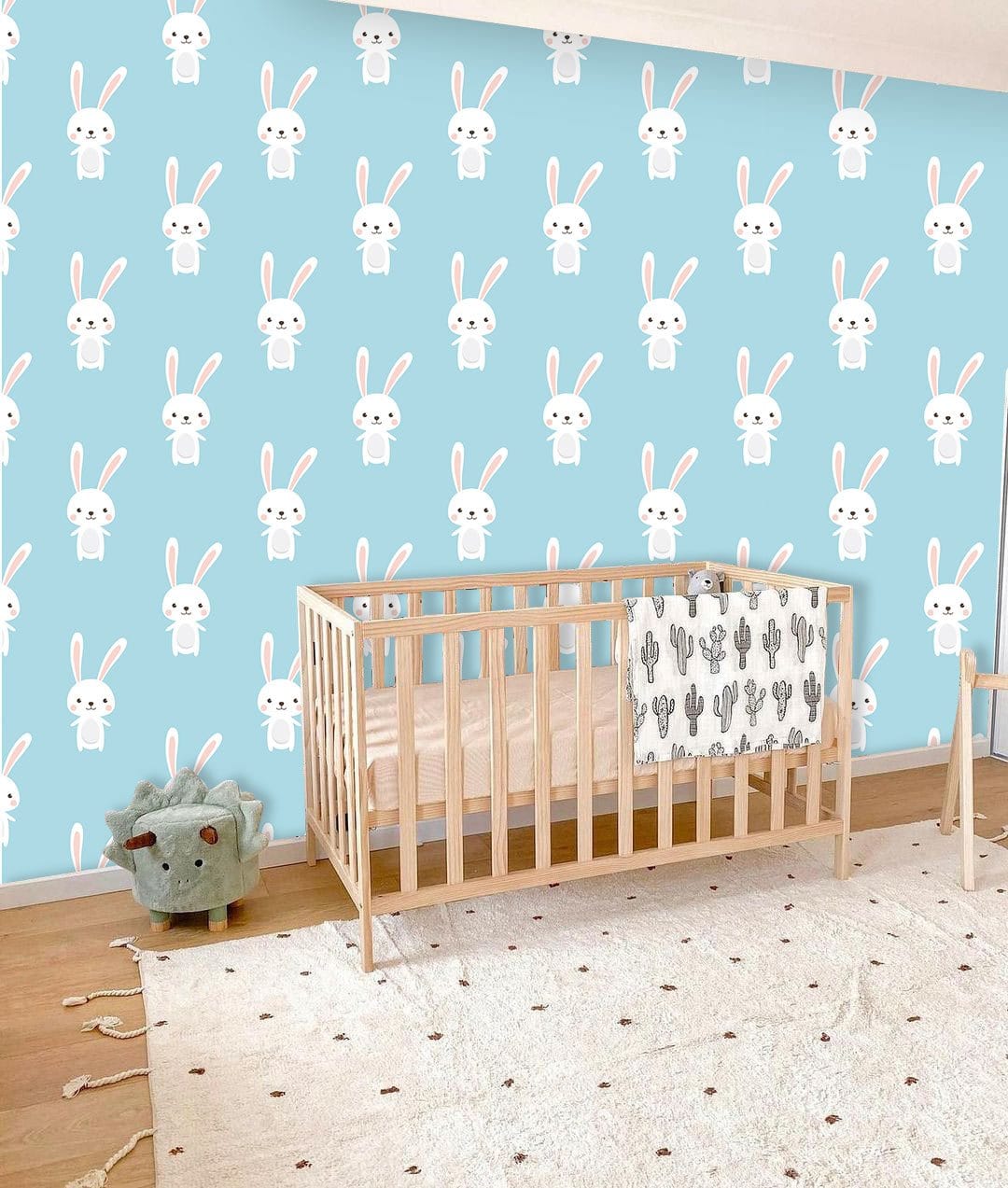 Inspirez vos enfants avec notre caricature de caricature de papier peint mural. Ce Ever Wallpaper est conçu dans des motifs répétés de lapins blancs mignons sous un fond bleu pastel doux, qui est en train de la fuir du cœur et peut apporter à l'espace intérieur un nouvel attrait. Fond mural parfait pour la chambre des enfants et la crèche pour réchauffer vos chambres.