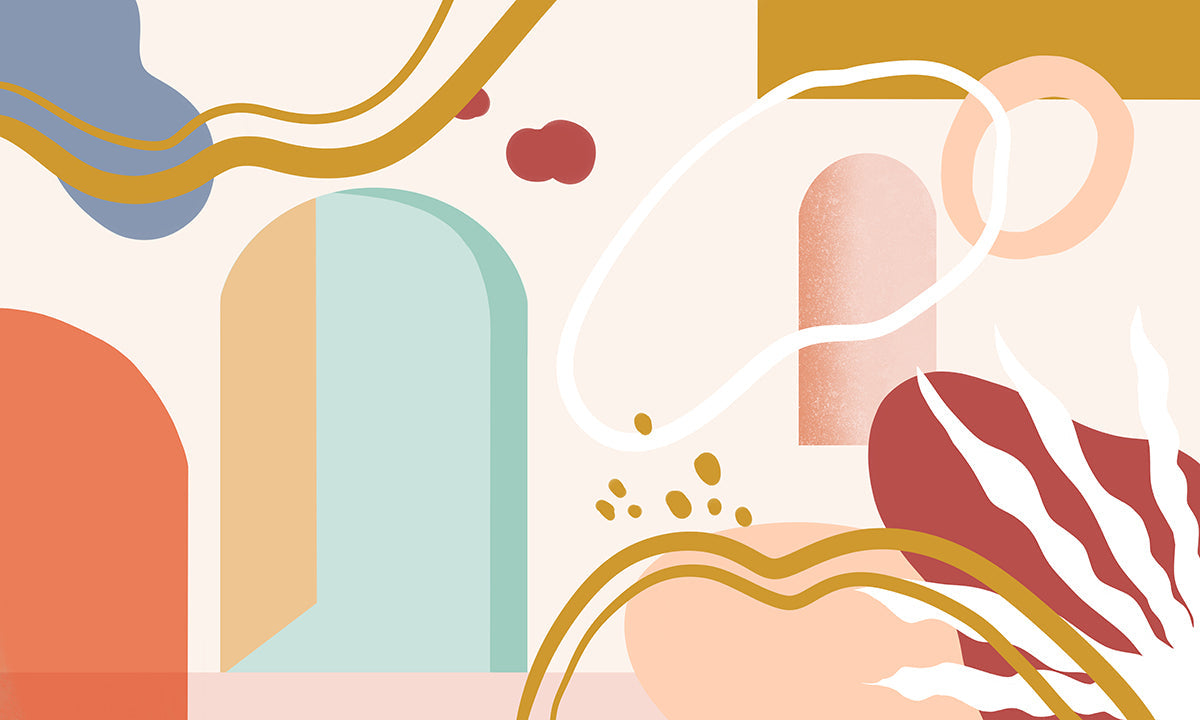 Cette conception de fond d'écran rassemble des formes de feuilles remplies, des griffonnages abstraits et des motifs créatifs pour créer un design abstrait, moderne et coloré. Avec des roses pastel, du blues poussiéreux, de l'orange, du brun, du blanc, et plus encore, les tons de cette pièce aident à donner vie à la murale et vous aideront à ouvrir votre espace.