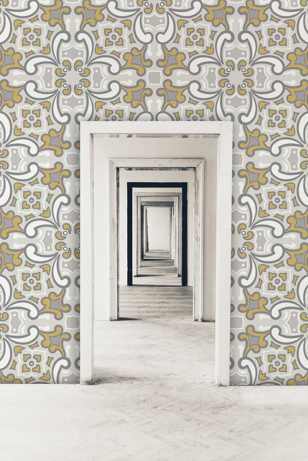 Bienvenue à la peinture murale du mur de carreaux dans votre espace et créez un style de maison moderne. Ce papier peint en carrelage est conçu en motif de damassé jaune sous un fond gris subtil, ce qui correspond parfait à n'importe quelle pièce avec des meubles sophistiqués, modernes ou contemporains. Disponible en Peel & amp; Type de papier et de papier permanent avec encres en famille. Préparez-vous pour un design d'intérieur magnifique!