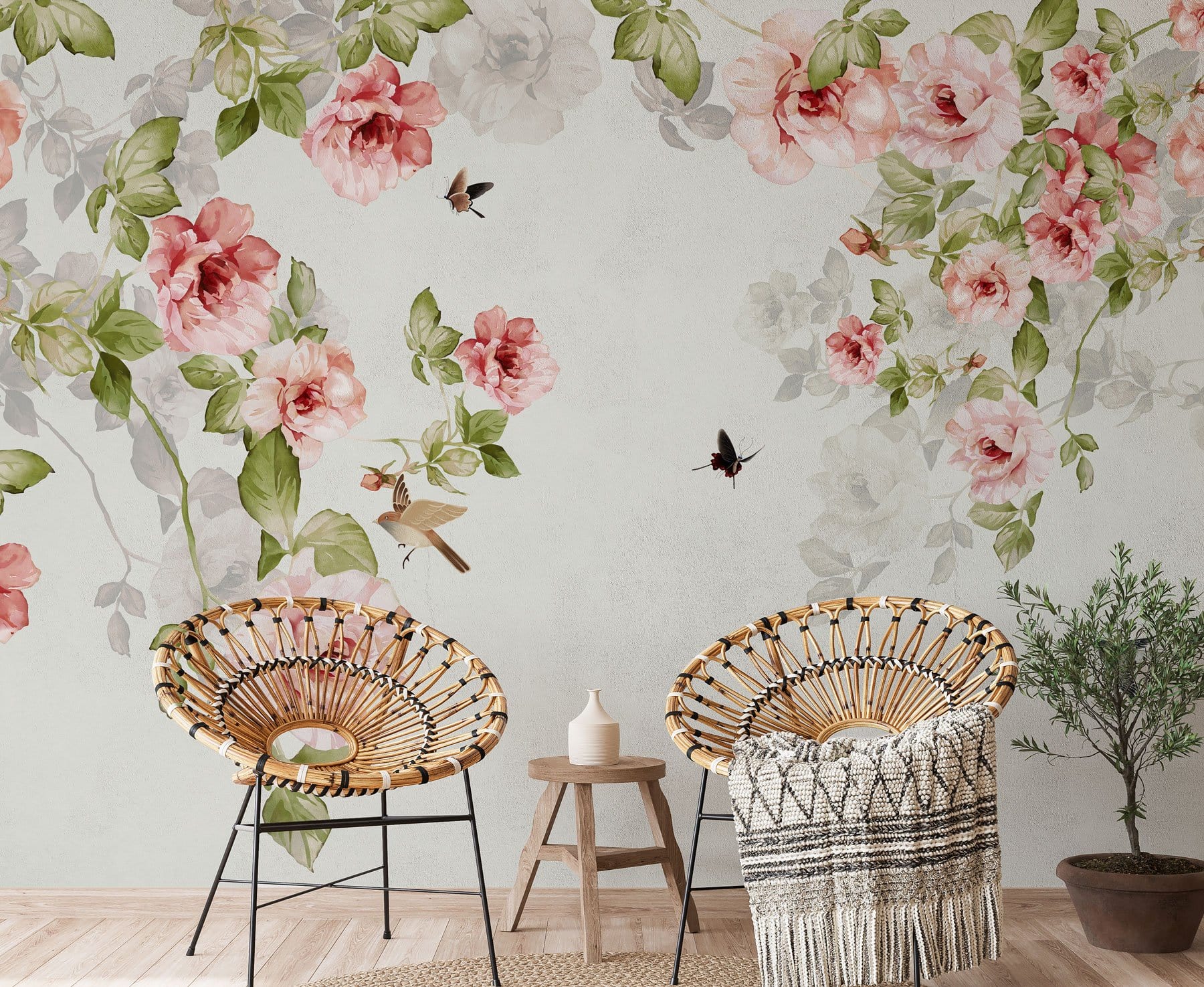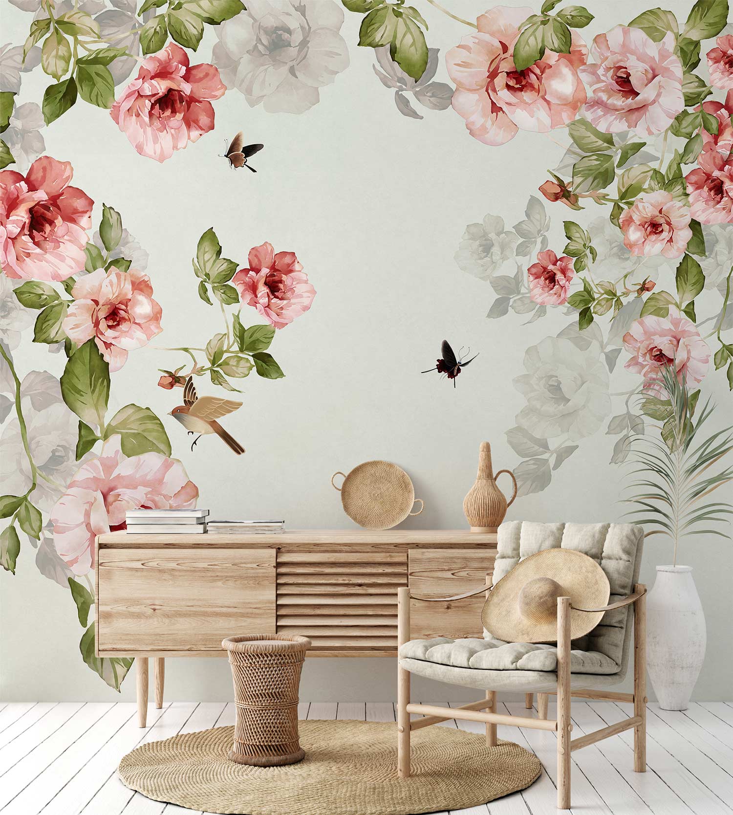 Obtenez cet look floral vintage élégant avec des roses de Chine rose sur des rosiers verts et un fond pastel blanc. Ajoutez une sensation gracieuse à votre chambre et à votre salon. Disponible à la fois dans des fonds d'écran époustouflants et permanents amovibles. Imprimé avec des encres sécurisées pour l'enfant.